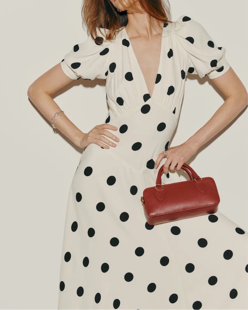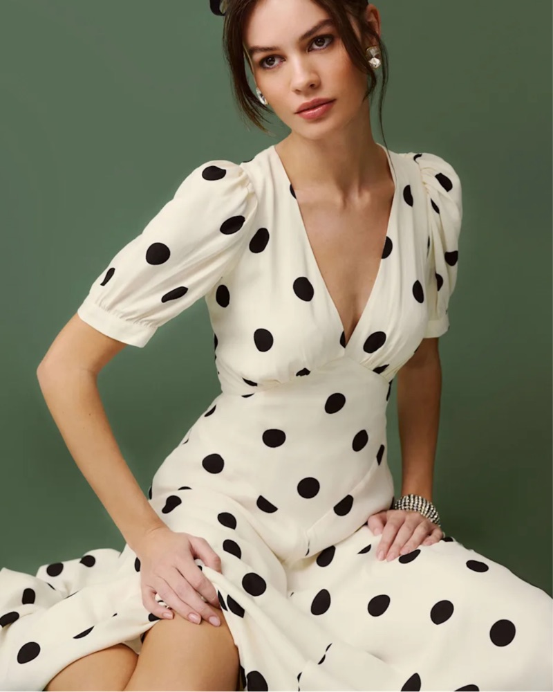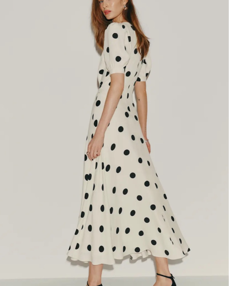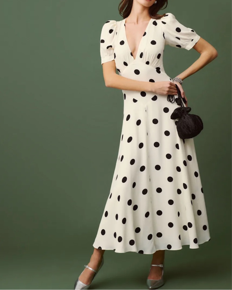 Reformation long polka dot dress, naira dress, long polka dot maxi dress
