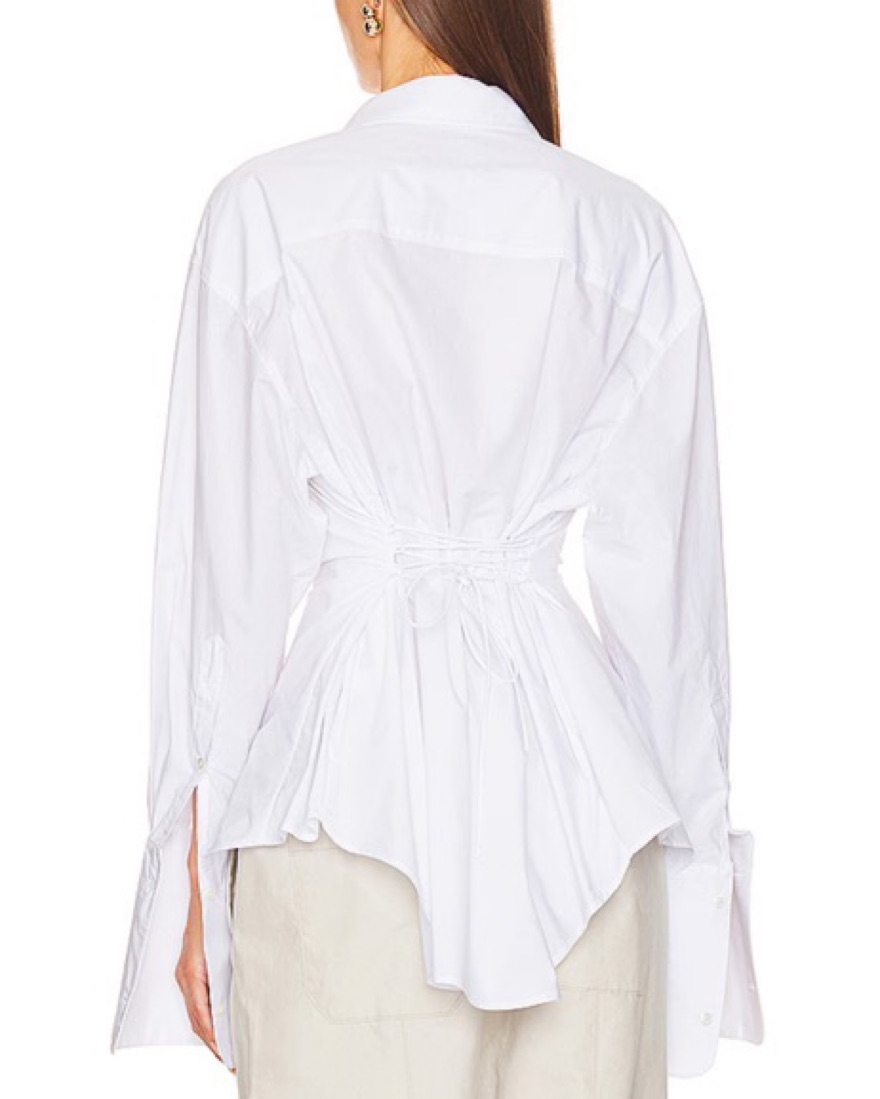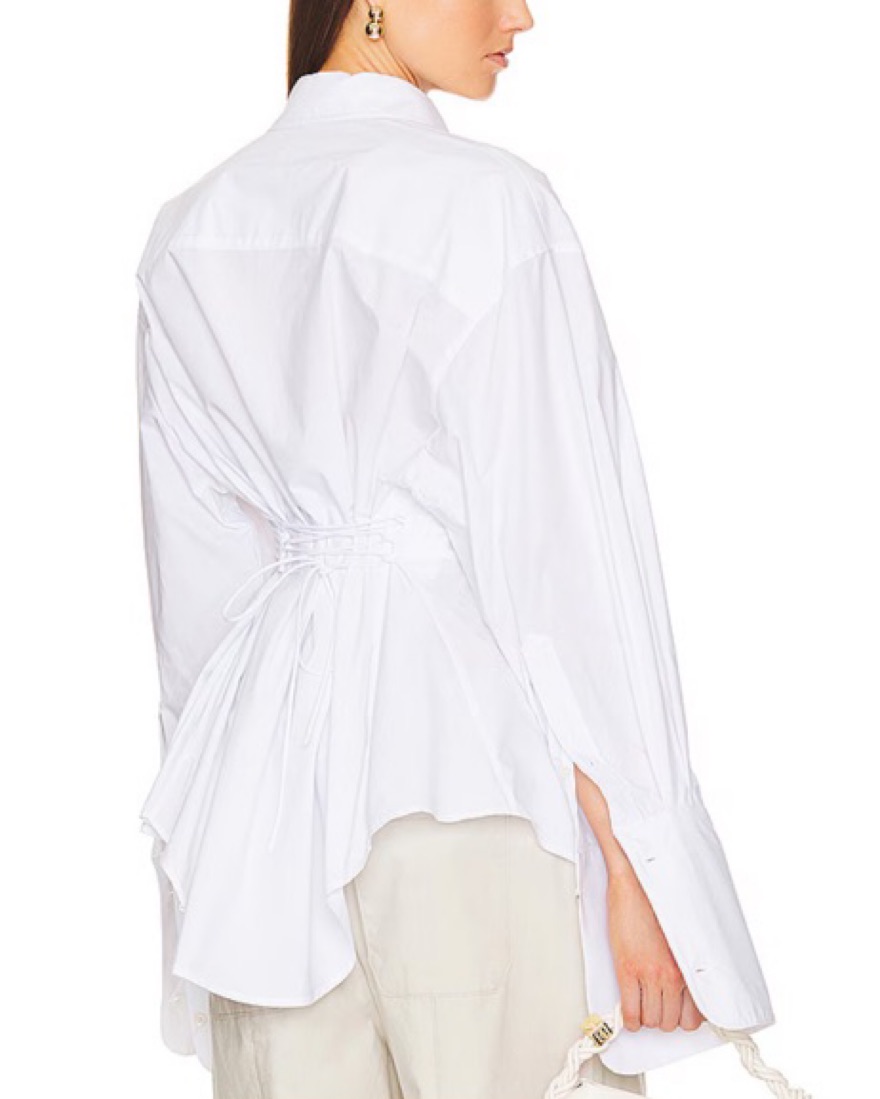 Lace-up back tie with Asymmetric ruffled hem Elongated flare sleeves with button cuffs Lightweight poplin fabric