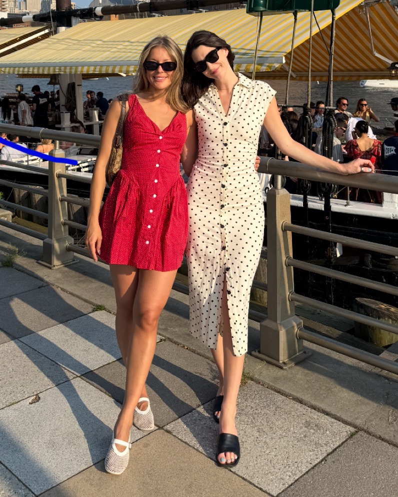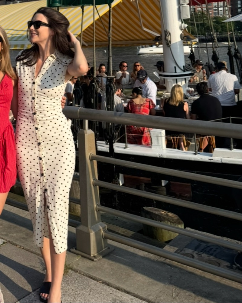 Midi dress, off white and black dots. True XS and linen so not much stretch. Great for US Open or end of summer
