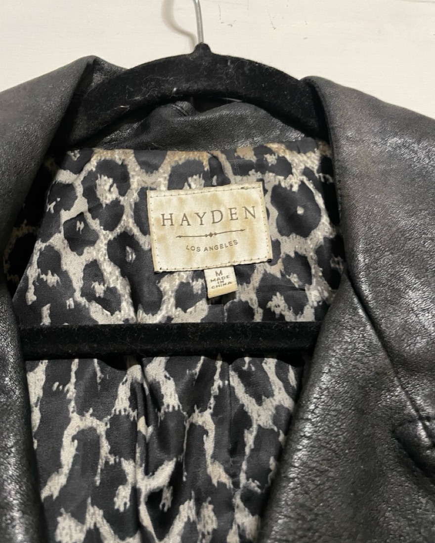 This stylish Hayden leather moto jacket exudes a bold, edgy vibe. The supple faux leather fabric and sleek silhouette create a chic, city-inspired look.