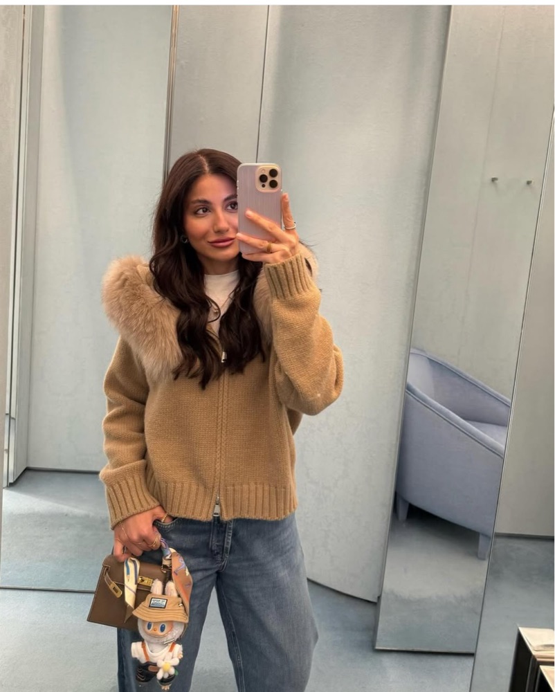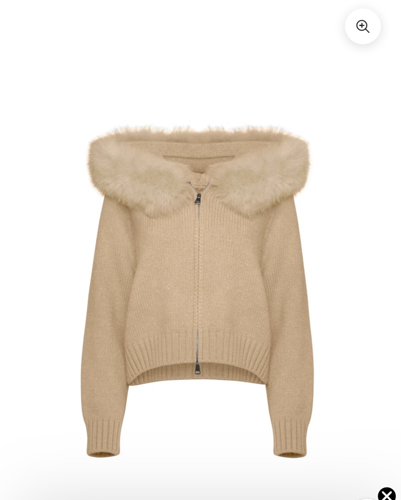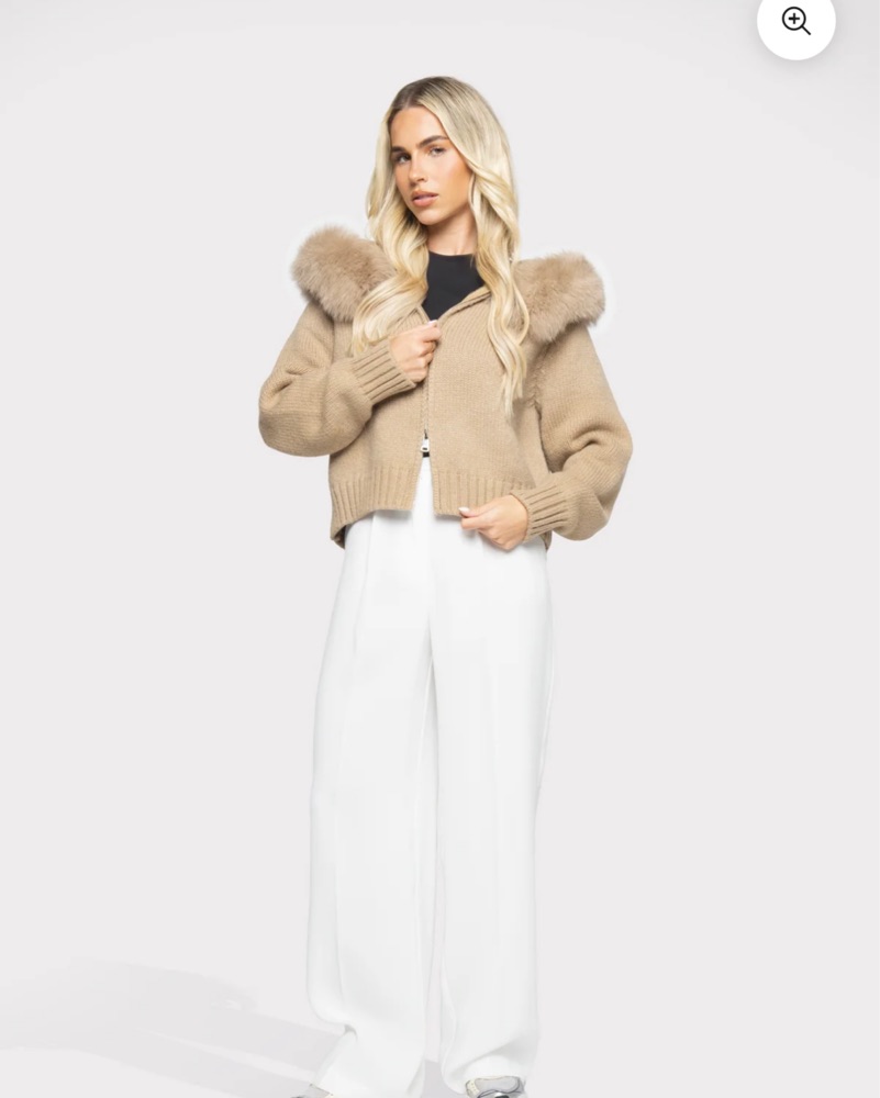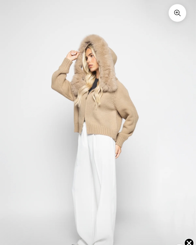This stylish and comfortable Maison Maia sweater jacket features a plush faux fur hooded trim, perfect for apres ski or winter occasion. Tags: Maison Maia, apres ski, fur sweater, winter, ski, snow, snow bunny.