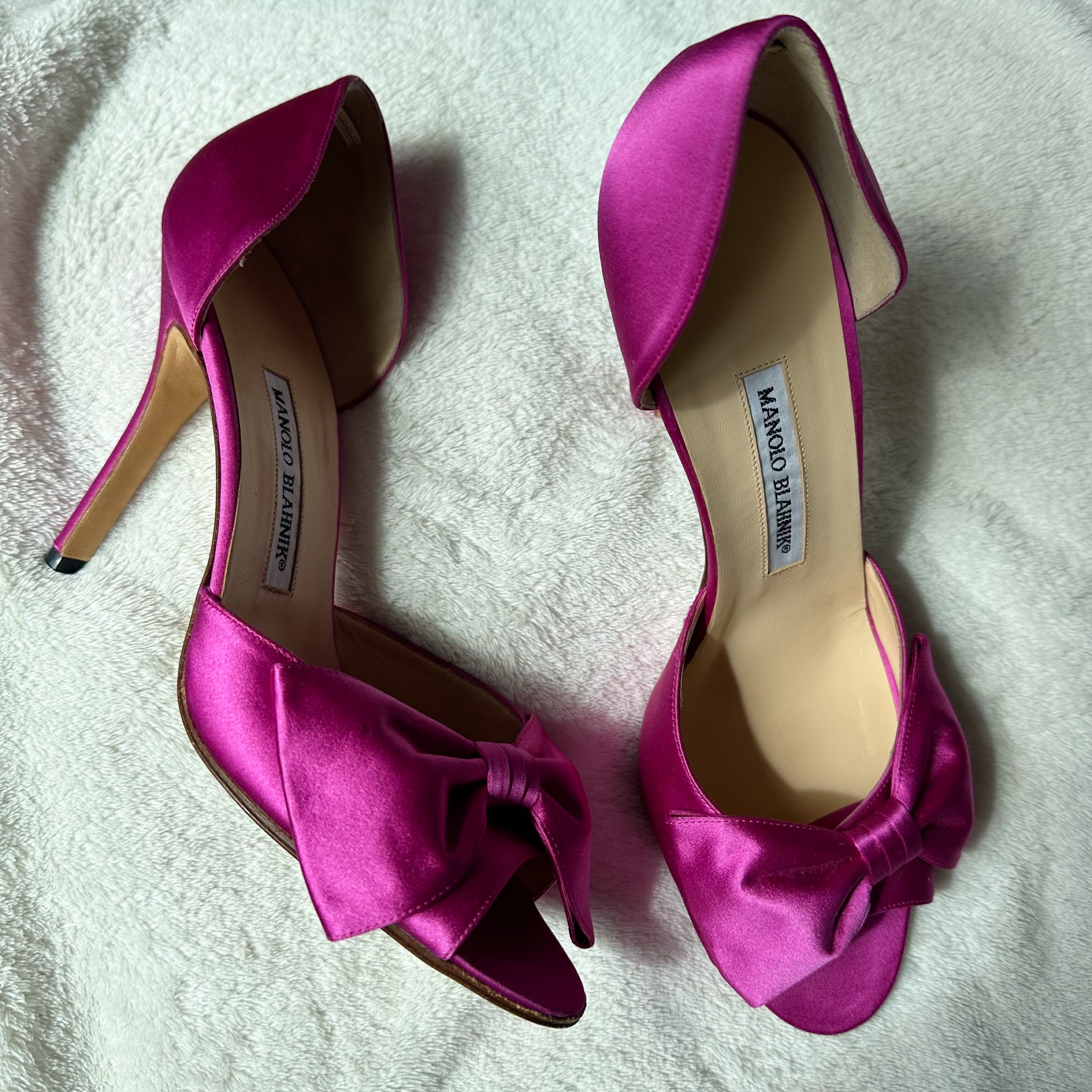 Fuchsia Manolo Blahnik satin D’Orsay pumps with bow detail on toe. IT 40 (best suited for us 9-9.5), 4” heel