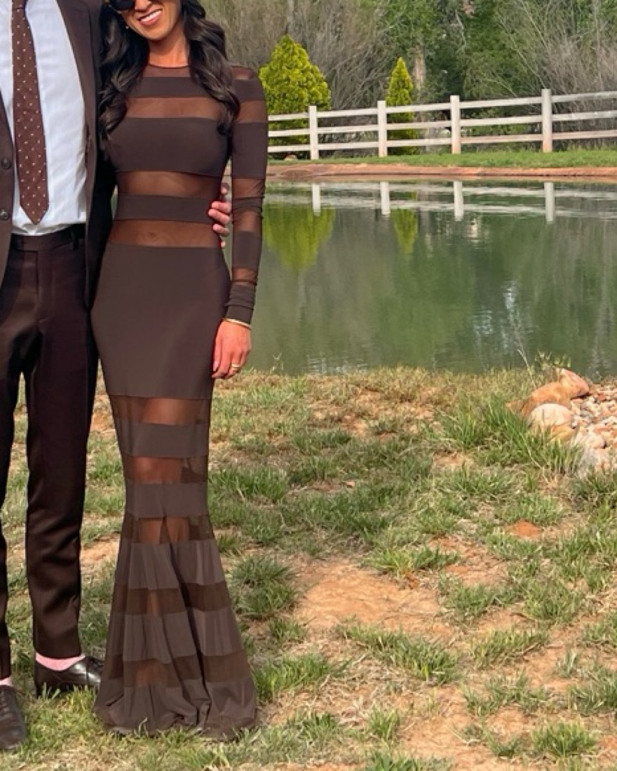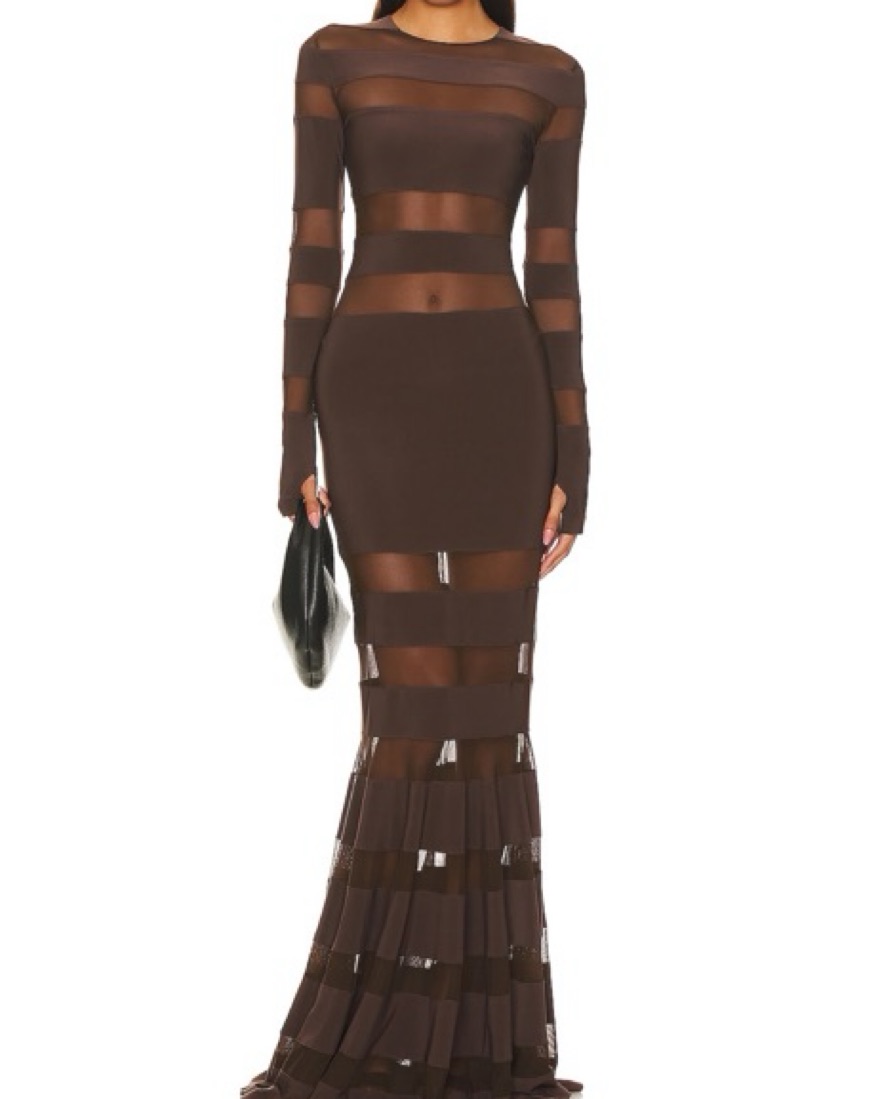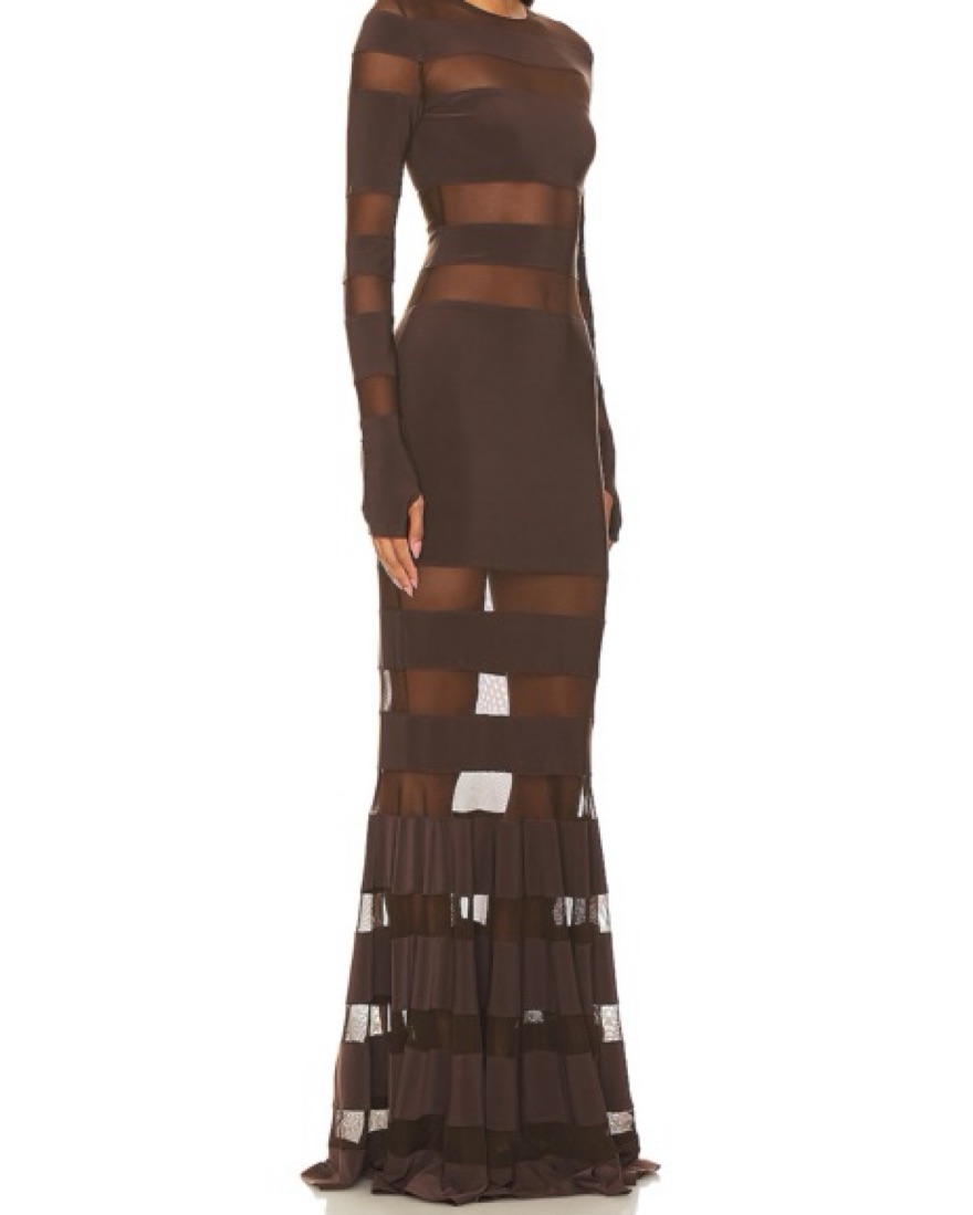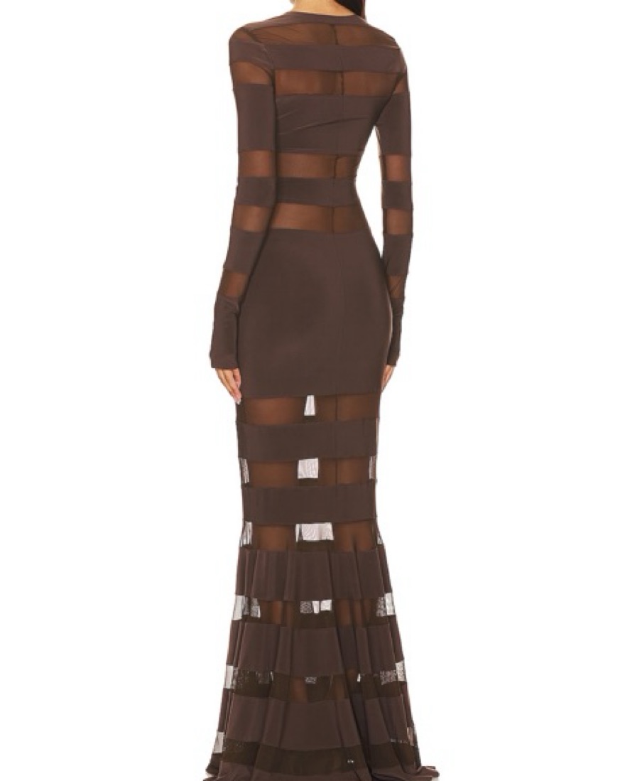 Norma Kamali Spliced Dress Fishtail Gown in chocolate & chocolate mesh. Size XS
