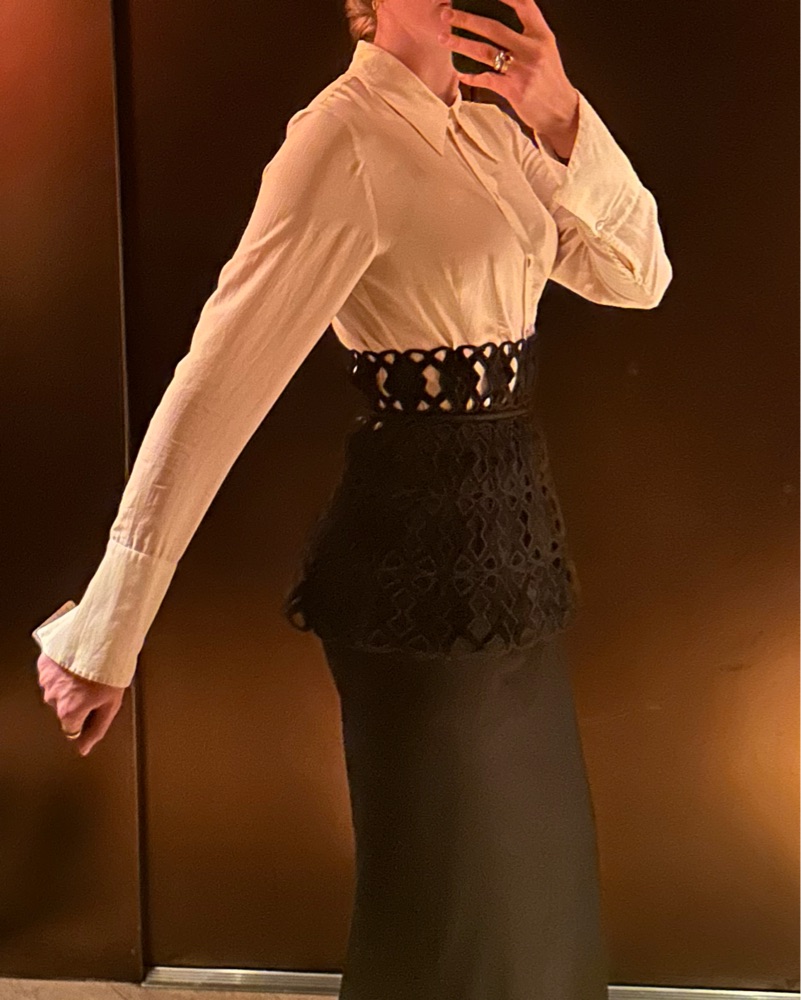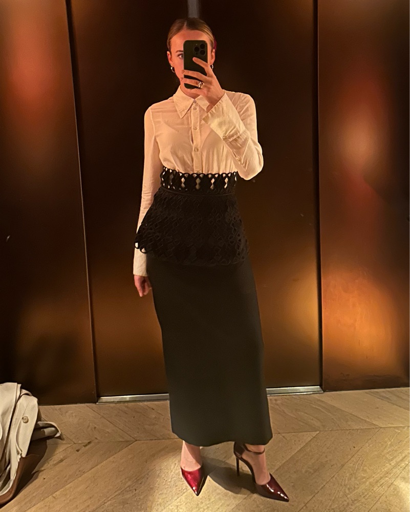 Set consist of a black wool pencil skirt from COS and a belt on top from Coosy (Madrid based company). Pieces can be rented individually too. Can be worn on top of a dress or skirt or even jeans.