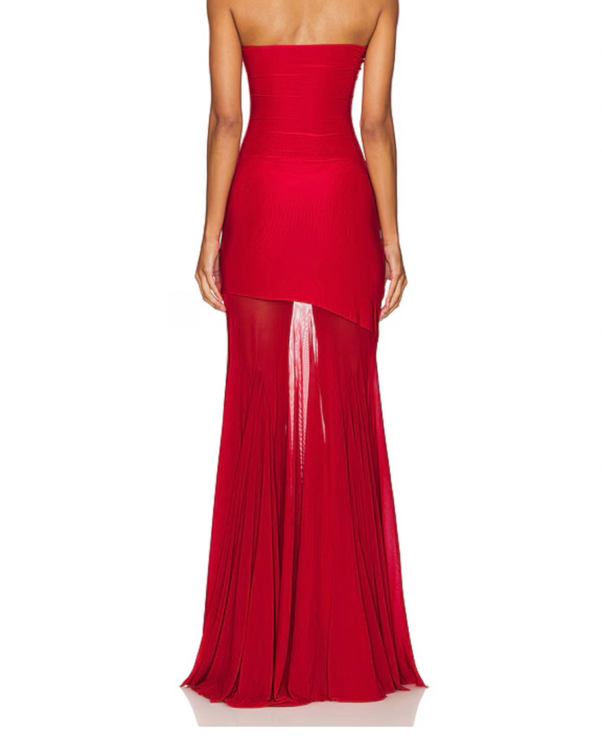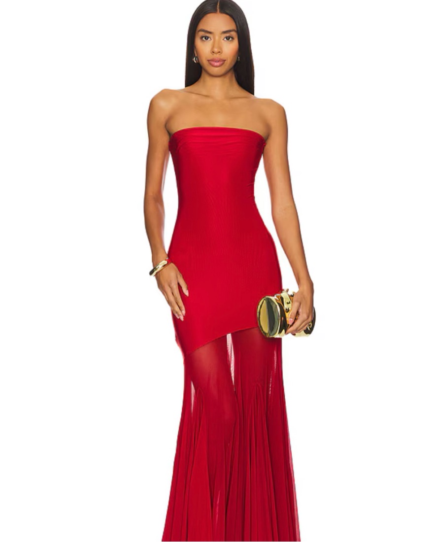Deme by Gabriela Red Dahlia Gown. Sold out on site. Perfect dress for fall and winter events tags: wedding guest, black tie, gala, formal, rehearsal dinner, welcome party, cocktail party, anna october, staud, cult gaia, loveshackfancy, A.L.C, house of cb, revolve, Retrofete, staud, rat & boa