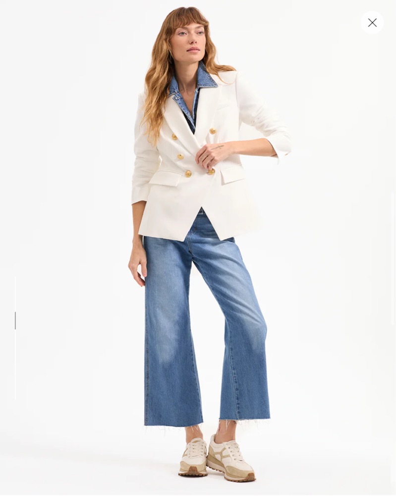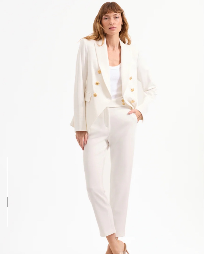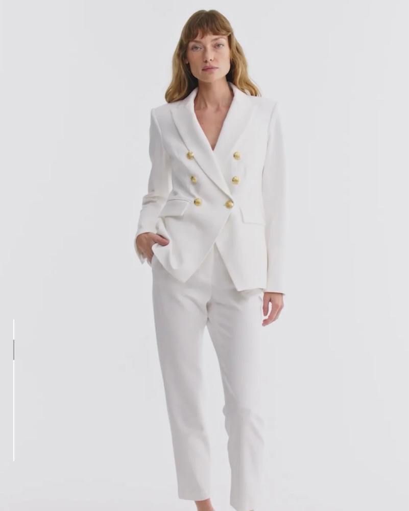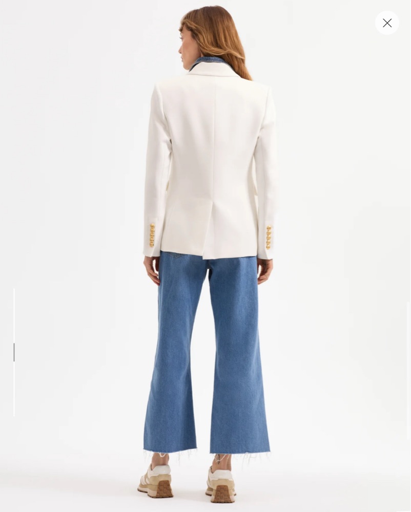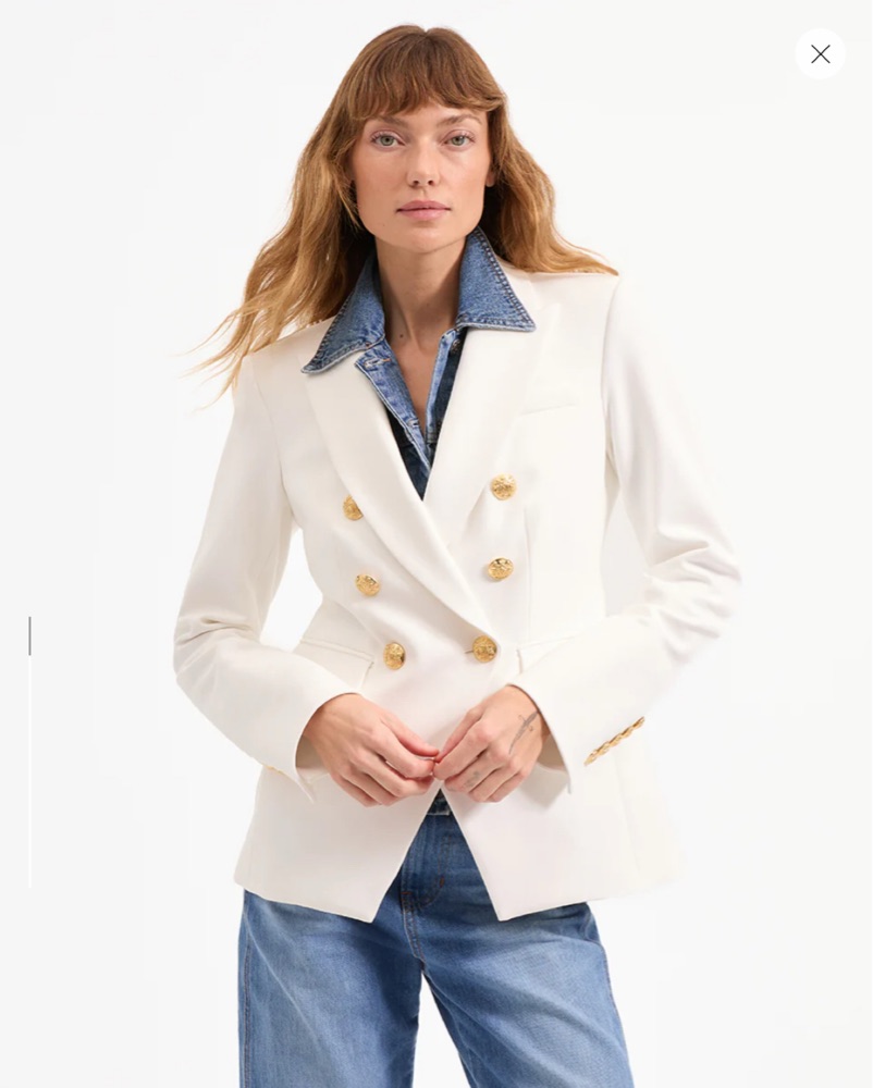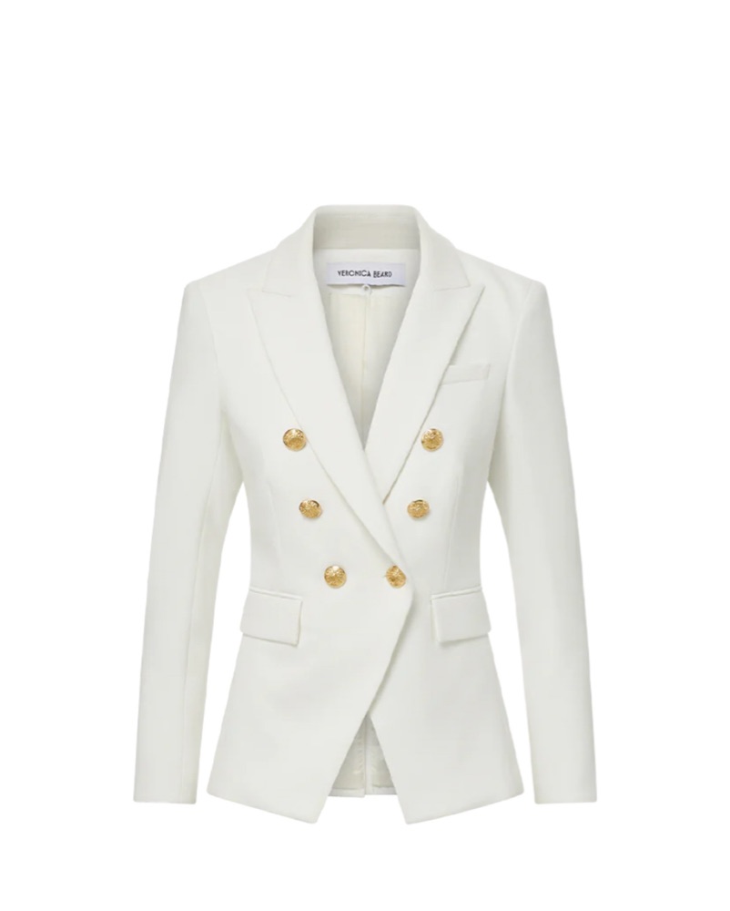 Veronica Beard Off White/Gold Miller Dickey Jacket. It is a veronica beard double-breasted blazer. This sleek, modern blazer is perfect for elevating your professional or evening look. Pair it with denim for a casual-chic ensemble or dress it up with tailored trousers for a sophisticated vibe.