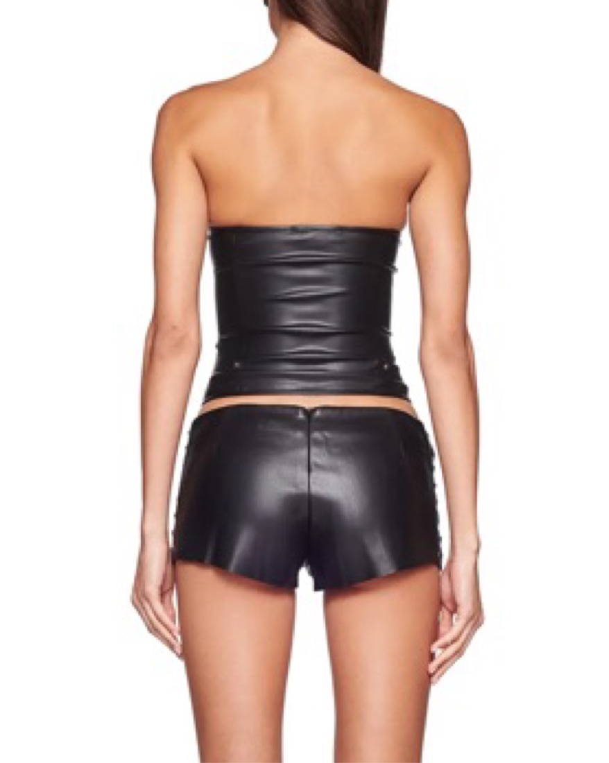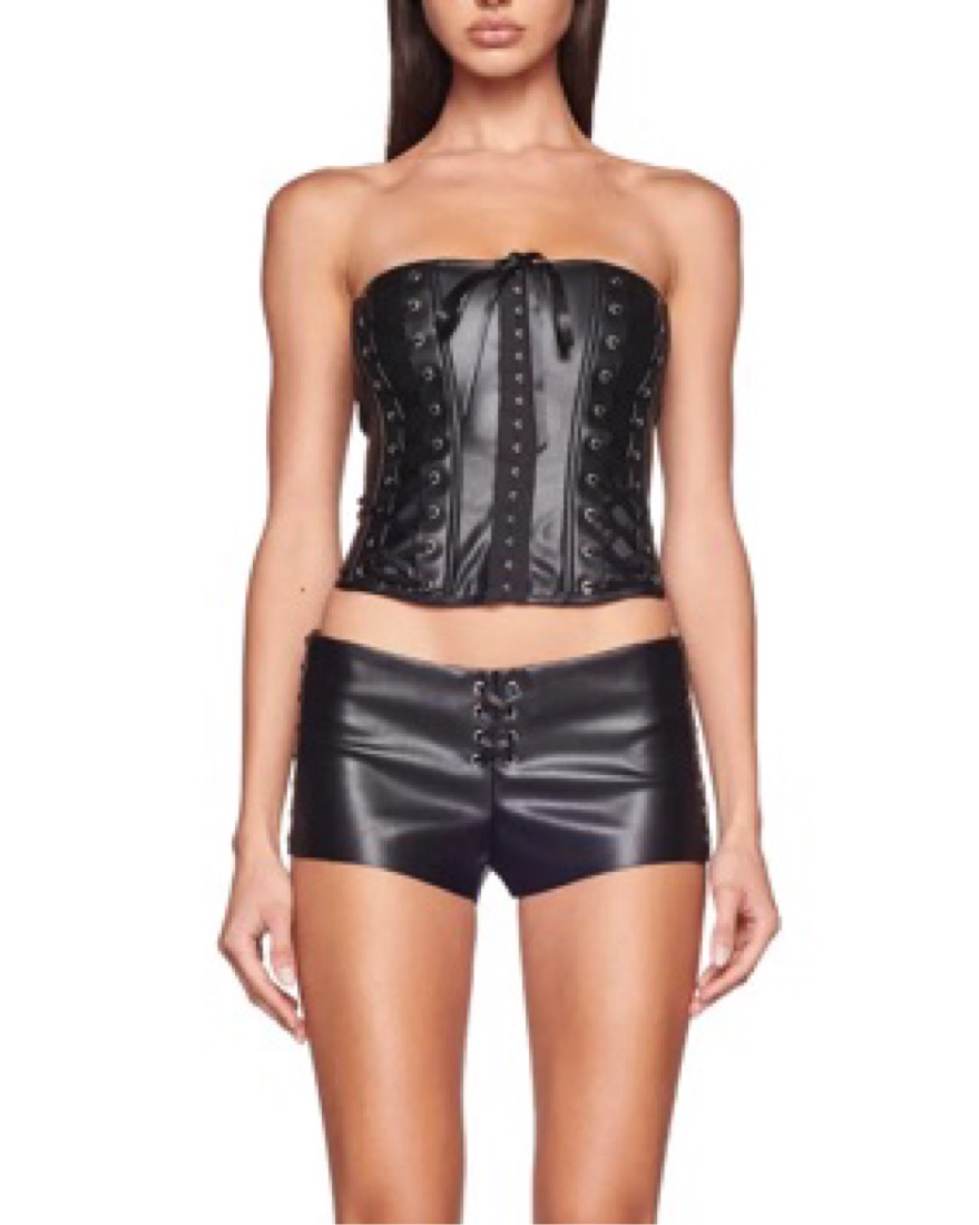 Stretchy black leather lace up corset(in xxs) and micro shorts (in xs) - message me and you can rent individually!