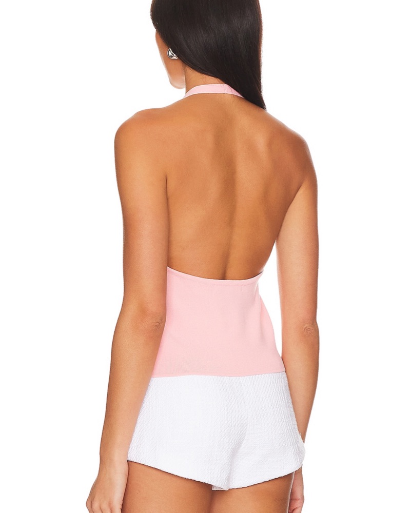 This fashionable halter jumpsuit in a soft blush tone is perfect for a night out or special event. The open back and sleek silhouette create a flattering, elevated look.