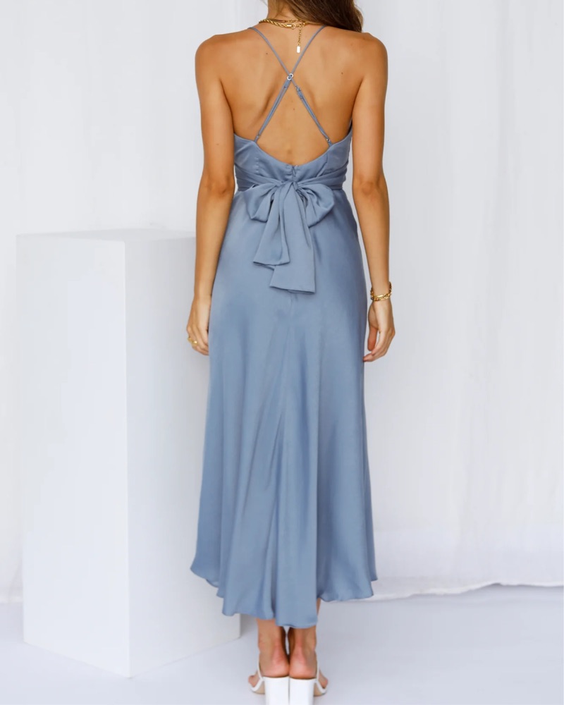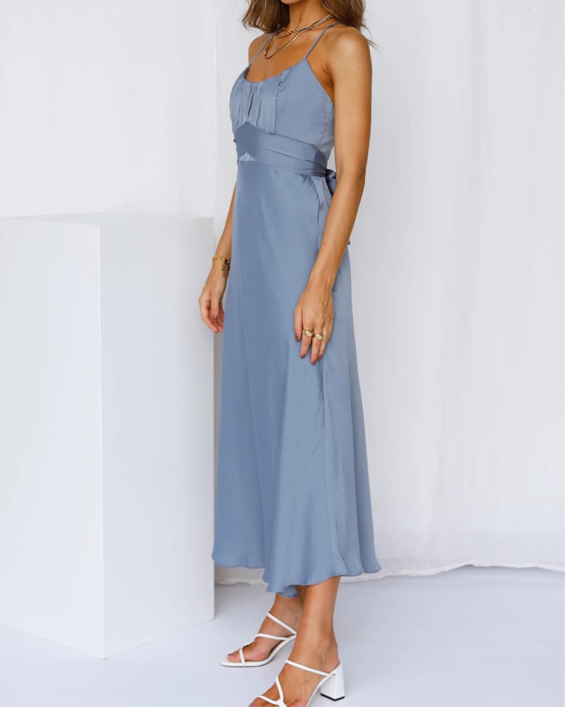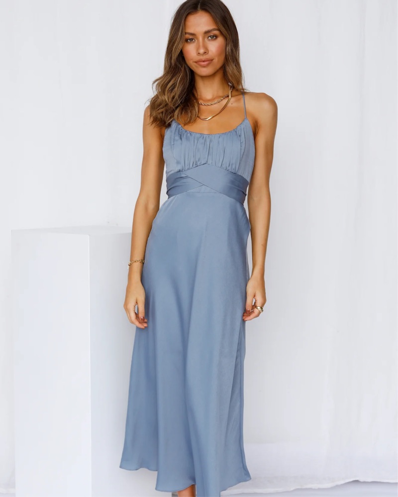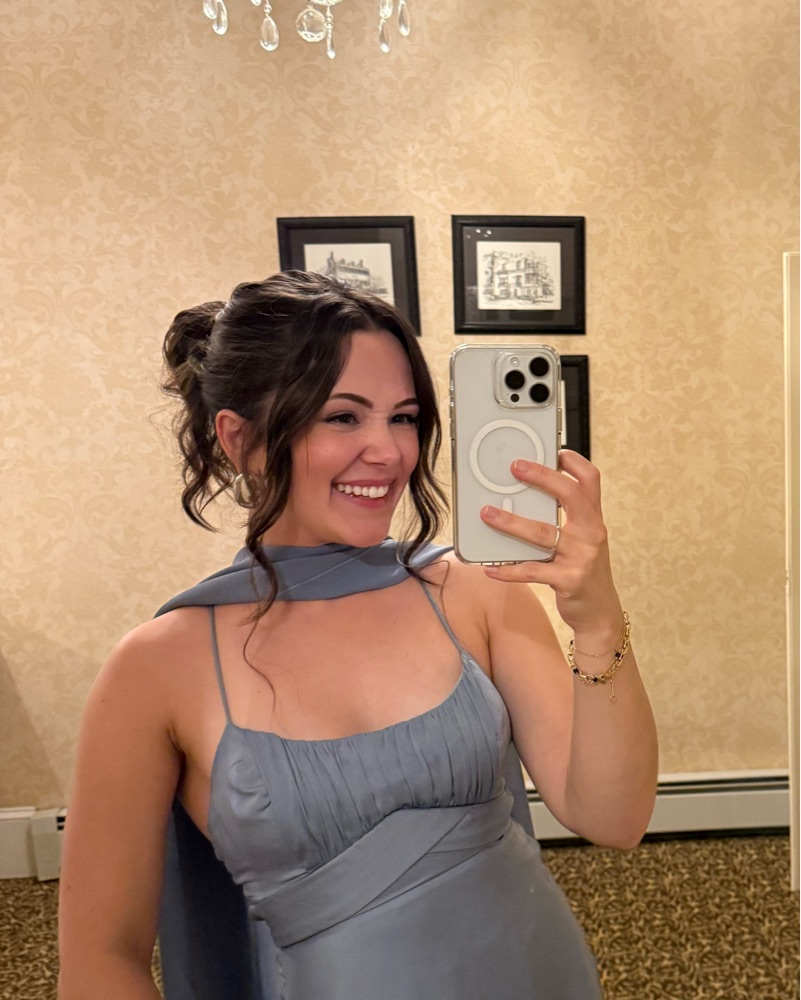 Adjustable straps. Flattering silhouette. Great wedding guest dress. I bought the scarf in the last picture to wear with it and it is almost a perfect color match. Perfectly compliments the dress and falls all the way down the back.