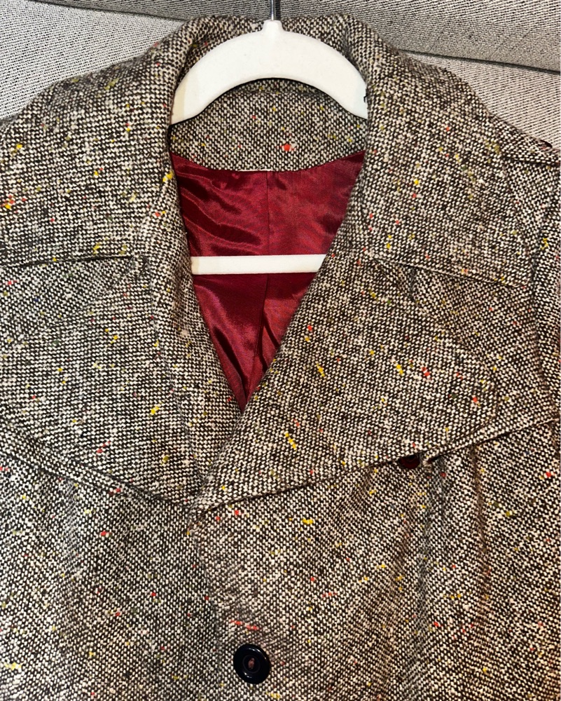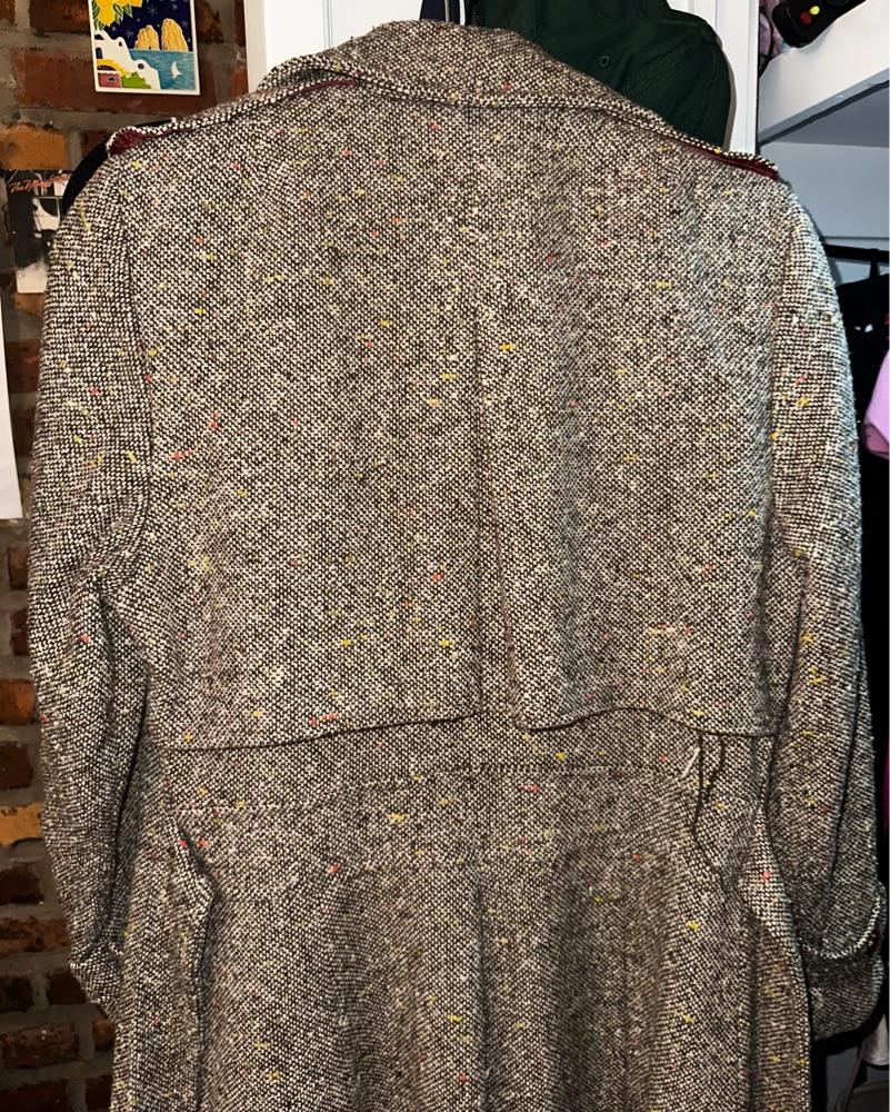 Extremely special vintage coat. I believe it is handmade as there is no tag and some seams are imperfect, but it’s so beautiful! Its grey/brown with tiny colorful stitches. No size but fits me and I’m 5’2 so I would say it’s an XS/S!