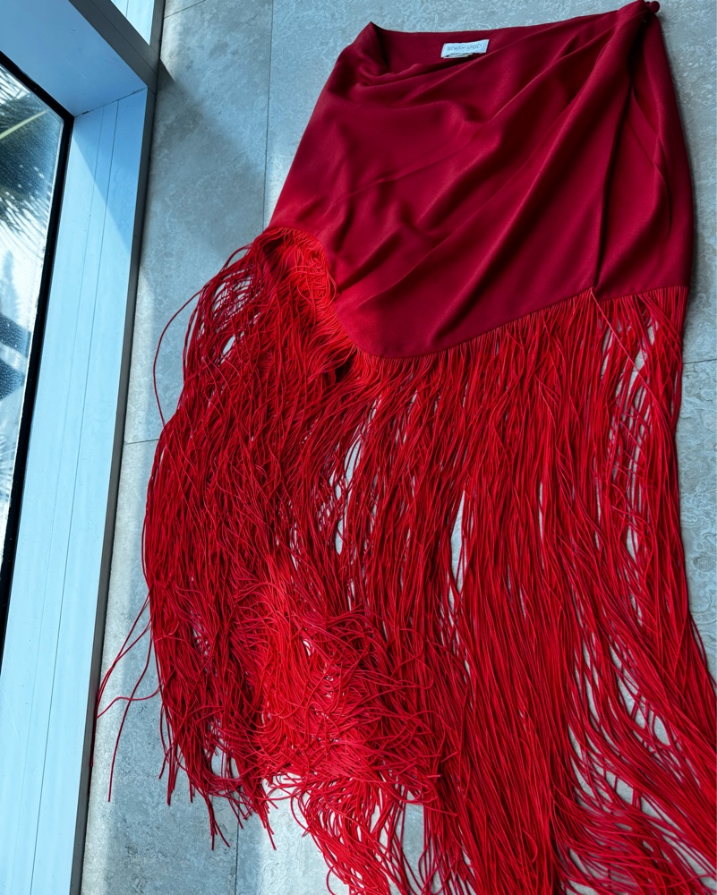 This stunning red skirt with cascading fringe is perfect for a night out on the town. The vibrant color and dramatic fringe details make it an eye-catching and chic choice.