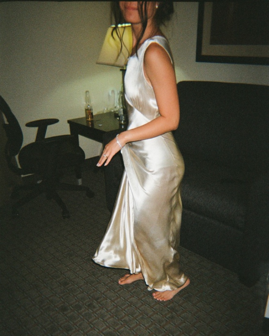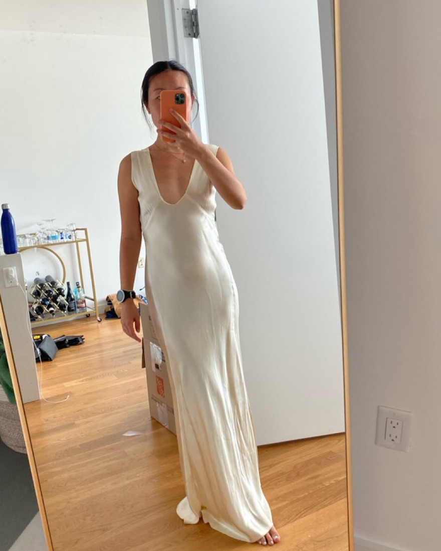 Sourced vintage wedding dress from 1900s. Bias cut 100% silk dress. It can be worn backwards for a deeper v in front. I wore this once for my after party. there is slight discoloration from age/time because this is true vintage silk but not noticeable. Please be careful with this dress!!