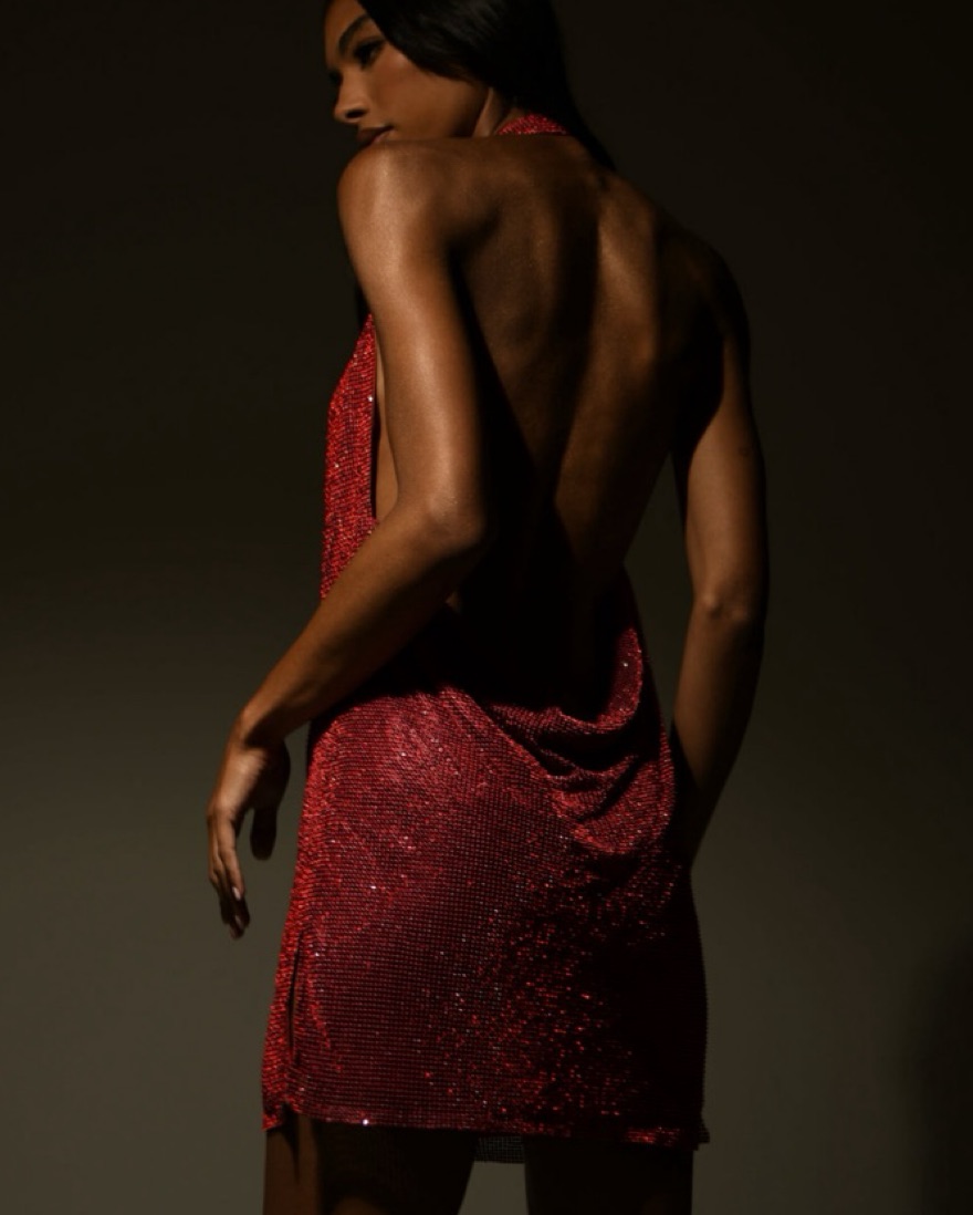 Low Back Mesh Mini Dress! This show-stopping dress features a mesh chain detail, with a halter neckline fastening and low back detail. This dress is everything!! I wore it once for my bday and it is in perfect condition!! Looks so insaine in video!