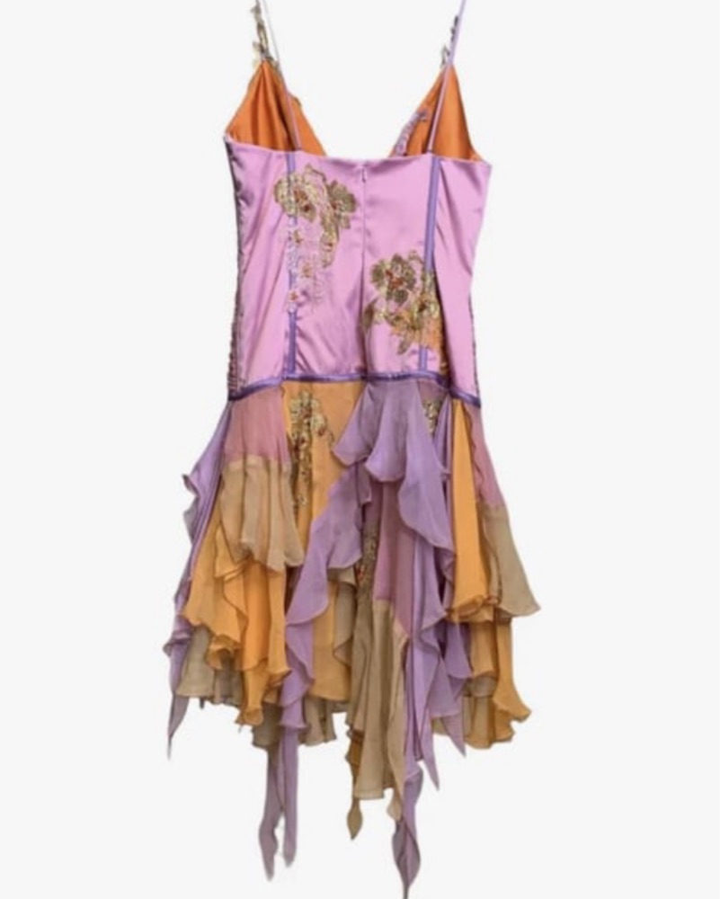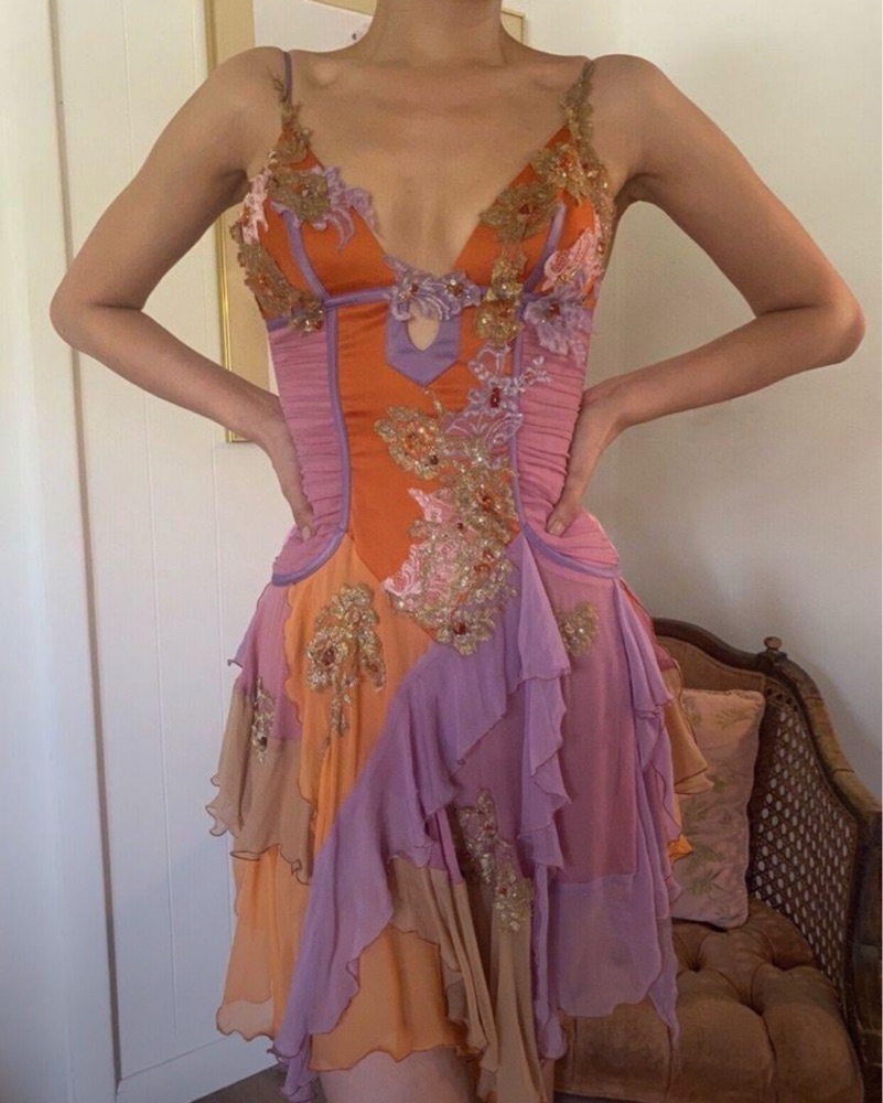 Most beautiful mandalay dress with corset detailing, ruffles, and embellisments. As seen on Addison Rae! Perfect for a summer garden party or special occasion. This piece is pretty delicate, note that dry cleaning is included in rental cost. 🤍