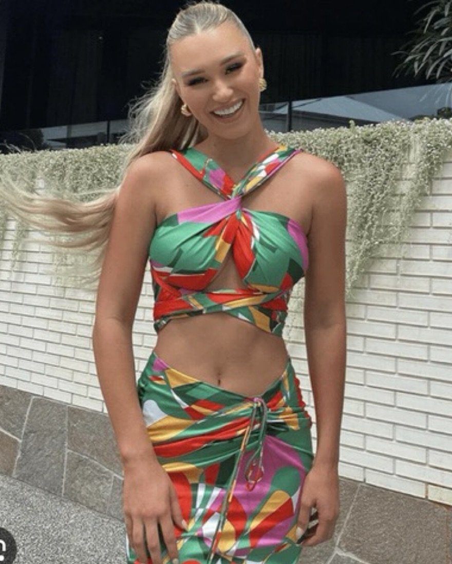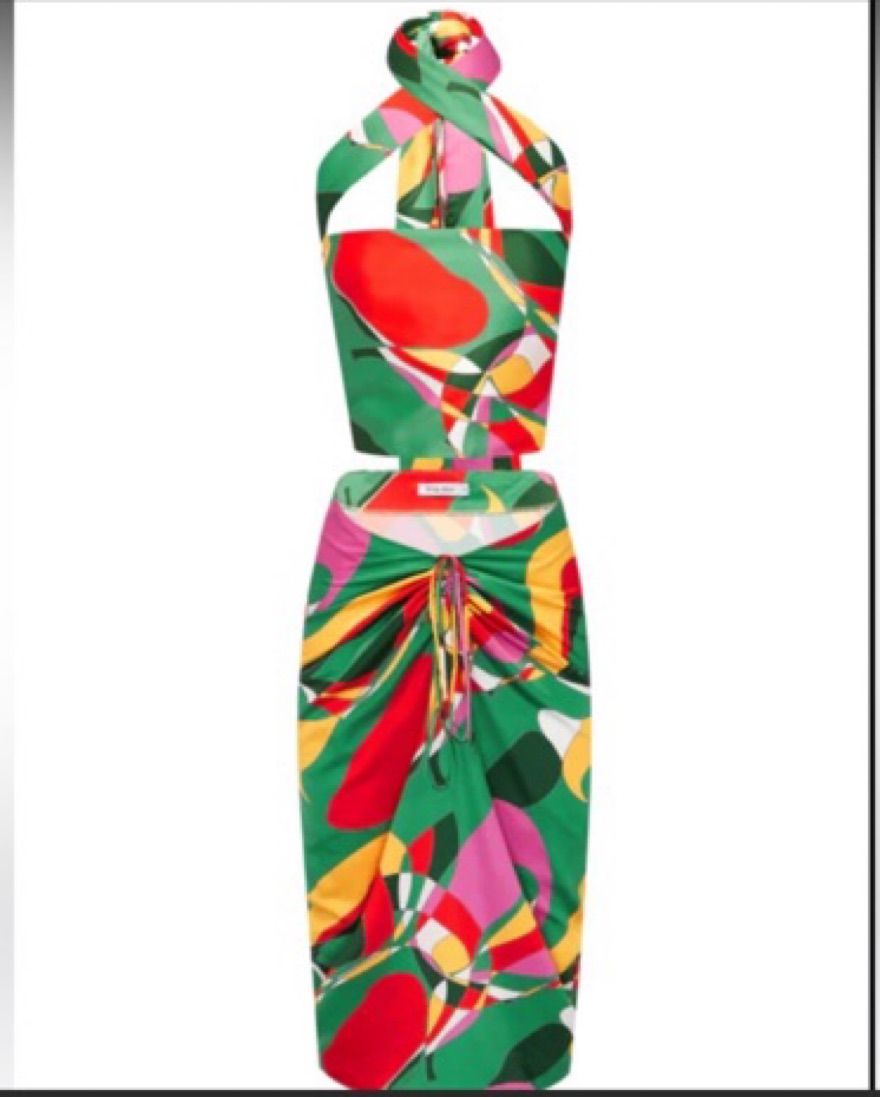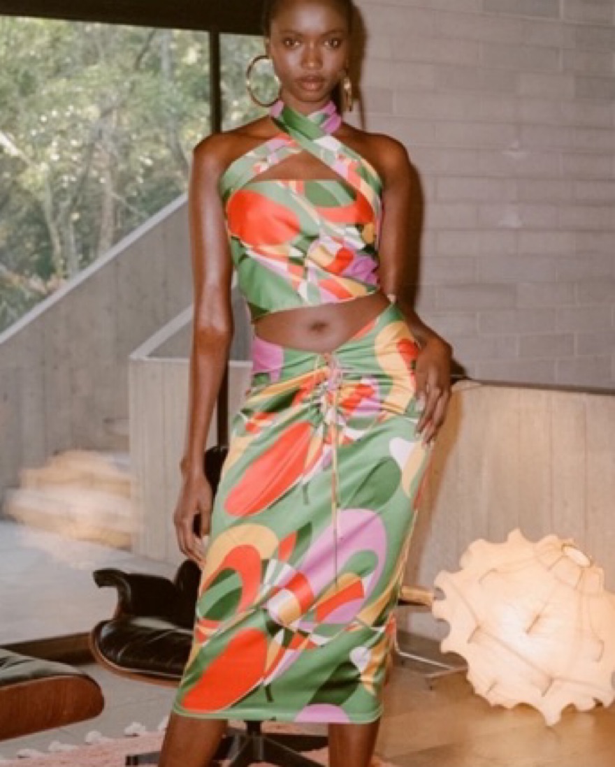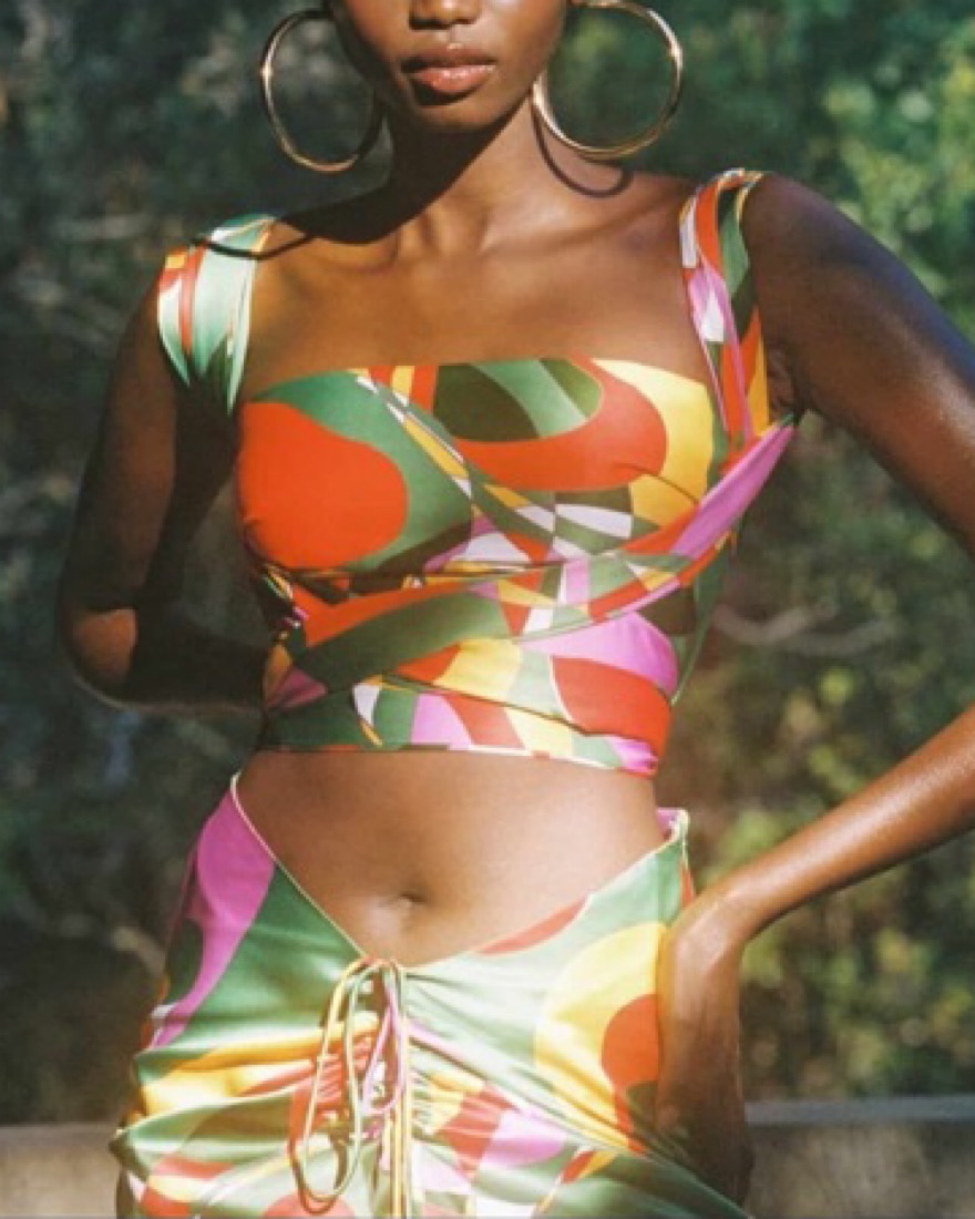 This set includes a midi length skirt that gathers in the front to a v shape at the waist. The top is a wrap around scarf style that can be styled multiple different ways. This is amazing for a vacation or party.