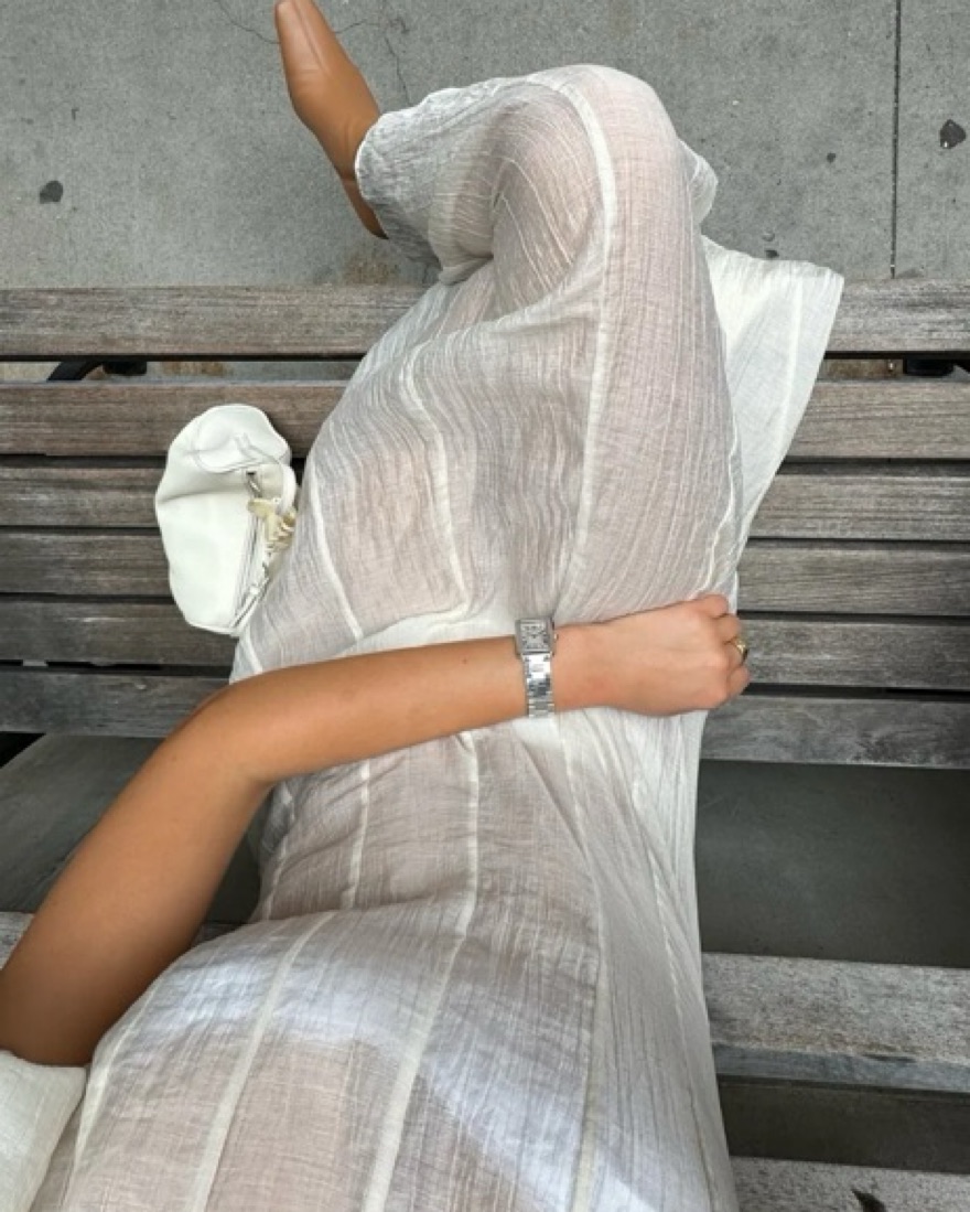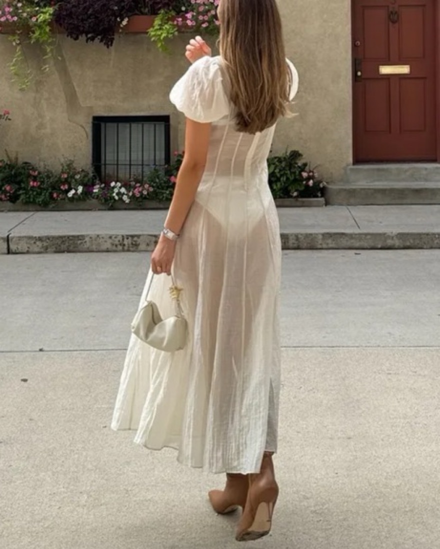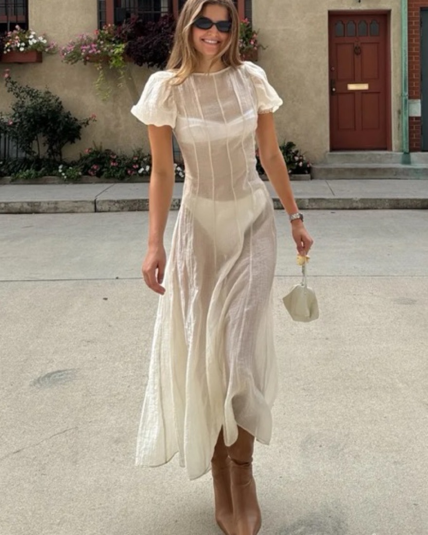 This ethereal maxi dress is perfect for a summer wedding or elegant event. The sheer chiffon fabric and puff sleeves create a romantic, feminine look. Sold out everywhere!!