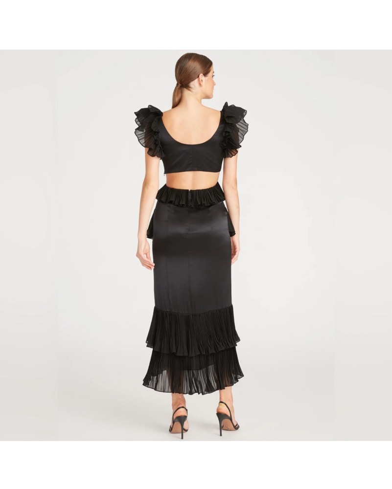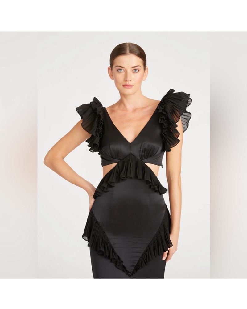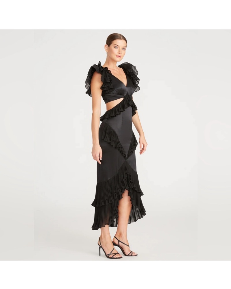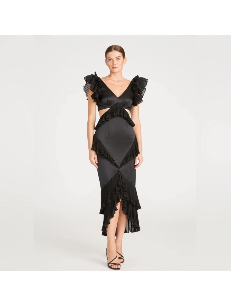 This striking black midi dress features bold ruffled accents that create a dramatic, eye-catching silhouette. The sleek, satin-like fabric gives it a luxurious feel, making it perfect for a formal event or special occasion.