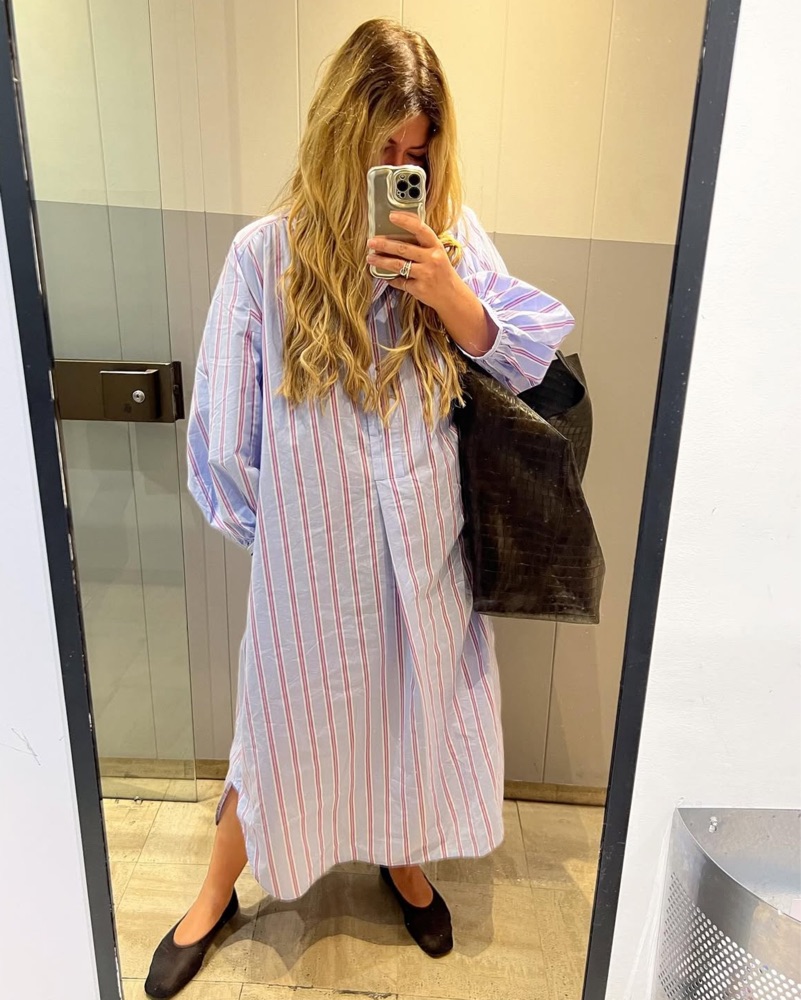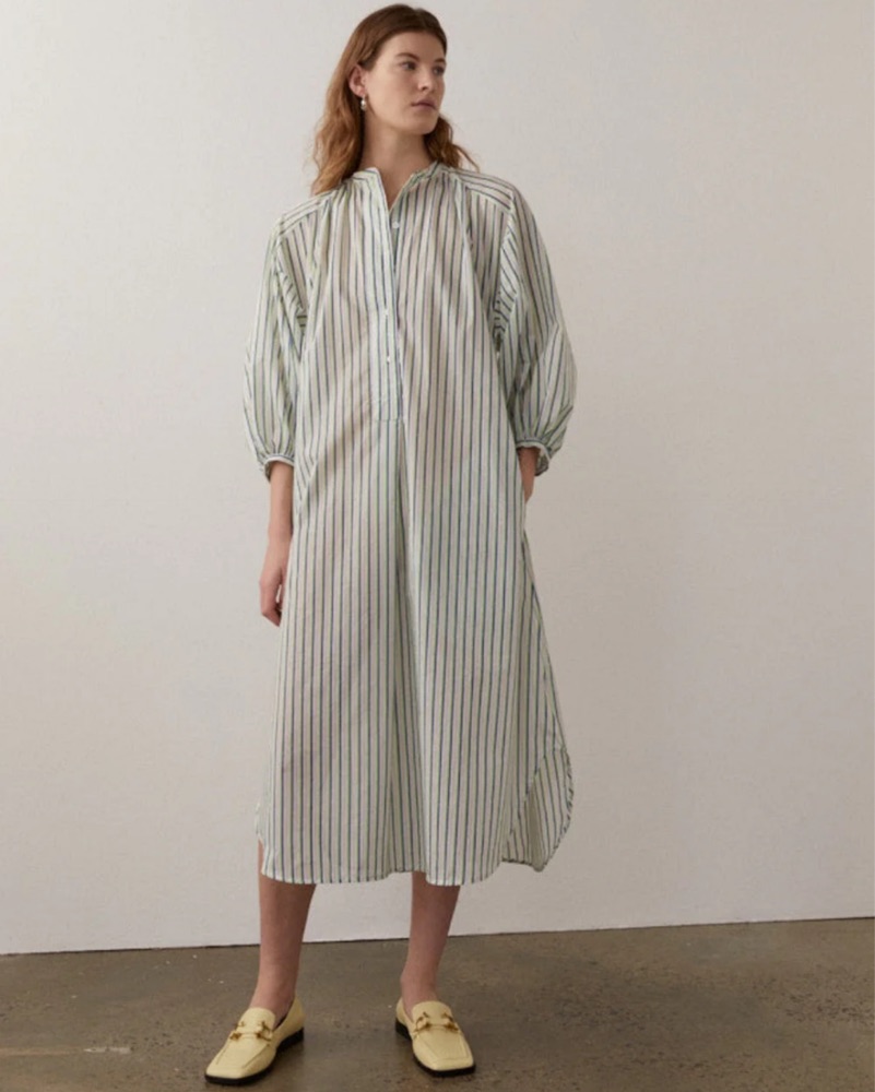Blue & Pink Stripped Dress. This laid-back silhouette is made for effortless style, with a classic bishop collar, generous sleeves and a relaxed, A-line fit. Dress it up or down for a fun, playful twist on a minimalist staple. XSS