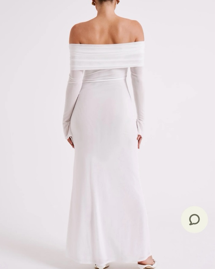 This stunning white off-the-shoulder maxi dress is perfect for a night out or a special occasion. The ruched bodice and long sleeves create a flattering silhouette. Slightly sheer.