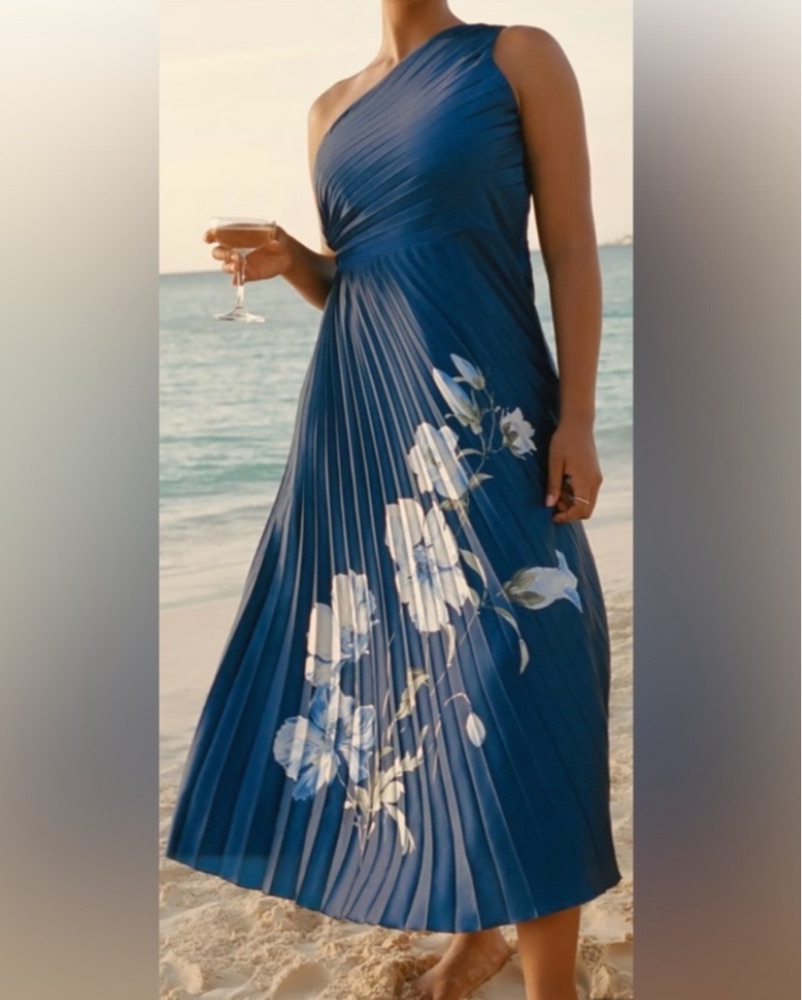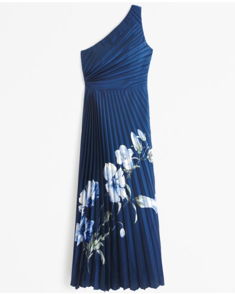 Elegant one shoulder dress with a pleated design and beautiful floral pattern. Perfect for special occasions! Worn once for a wedding