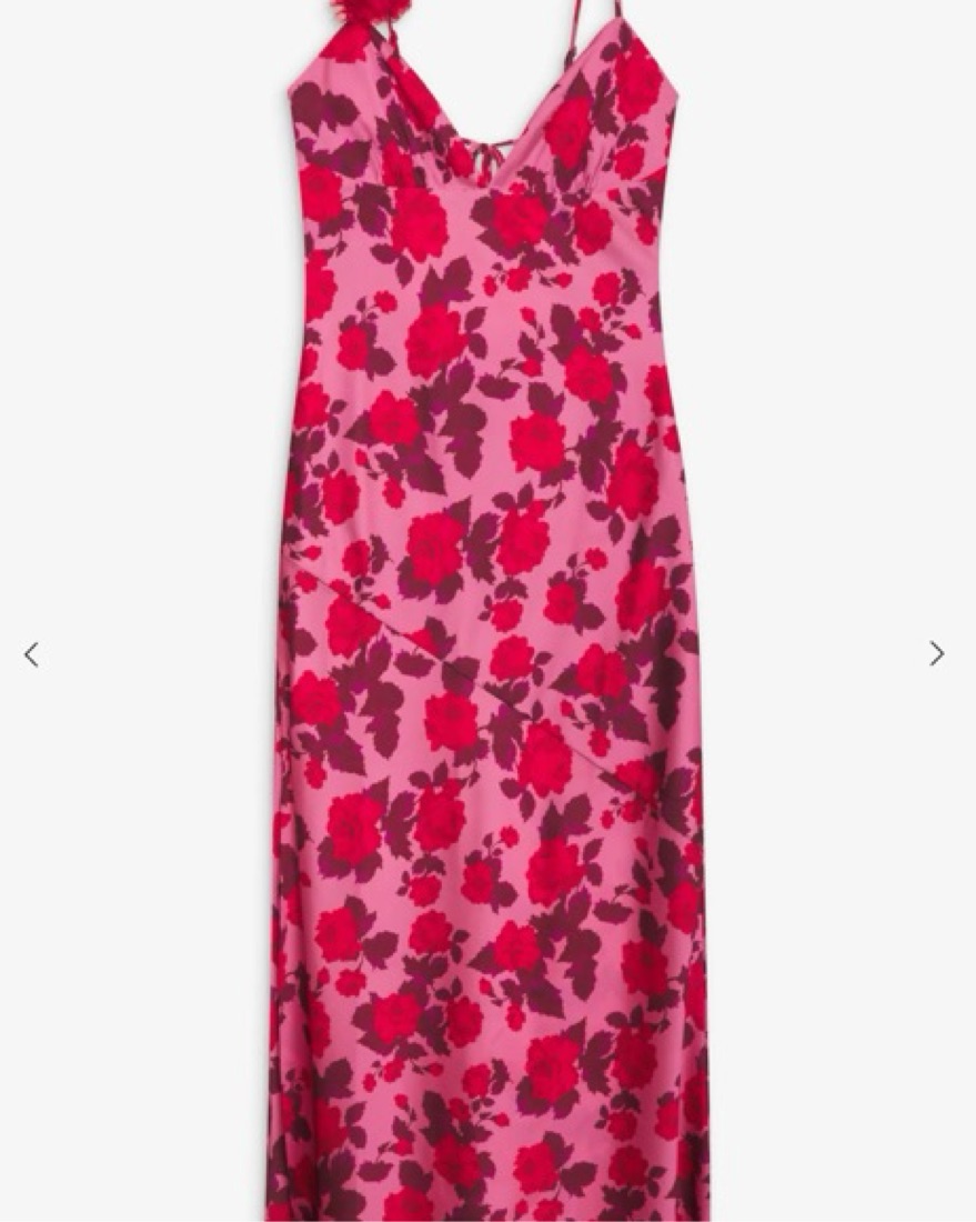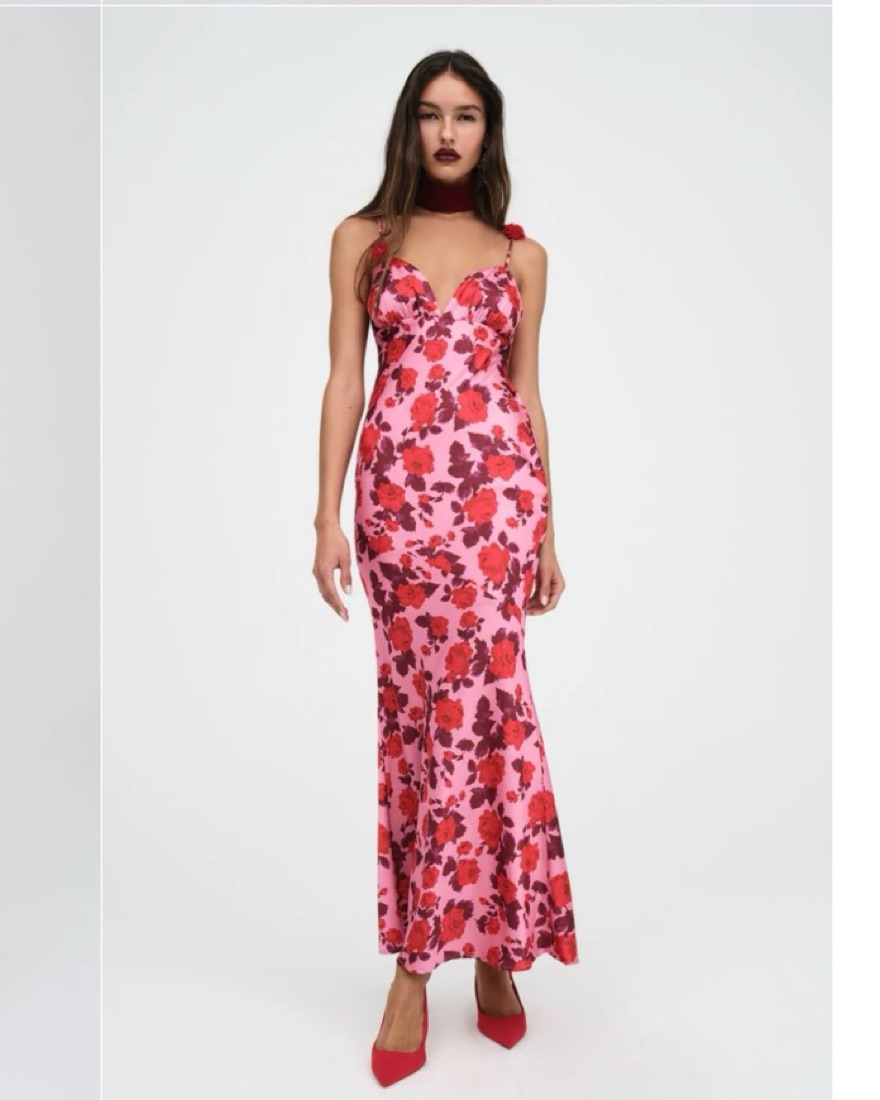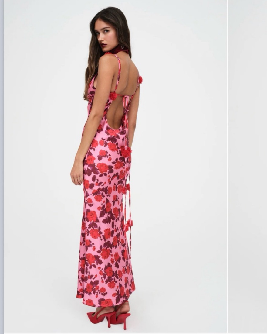 Pink & red floral maxi dress with beautiful 3D flowers sown onto the straps that flow down to the ground behind you. Got a million compliments on this dress at the wedding I wore it to.