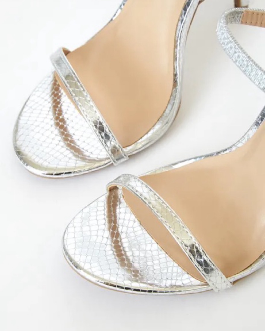 silver metallic | snake embossed | wrapping elastic ankle strap | 4.5 in heel