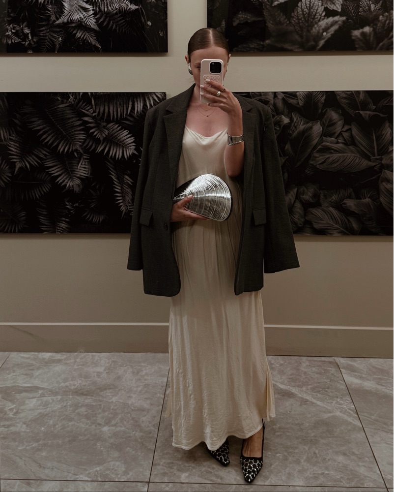 Silver Shell clutch bag from Mercer street. Fits a card holder, keys, small makeup, etc. Sometimes I’m able to squeeze in my phone (iPhone 16 pro)