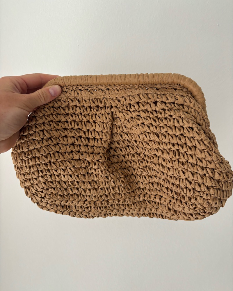 - Woven straw-style clutch in a natural tan color