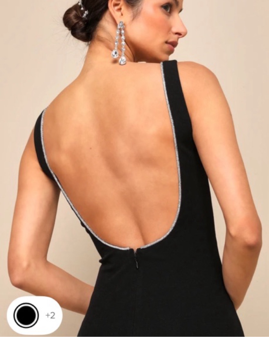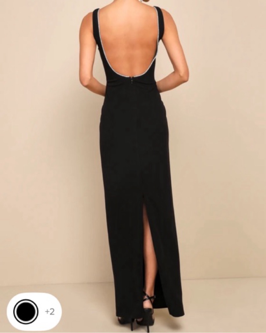 Beautiful black dress with rhinestones lining neck line and straps. Looks way more expensive than it was and is so flattering. Wore once to a black tie wedding.