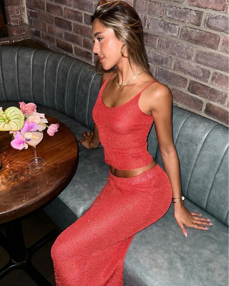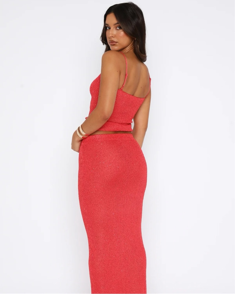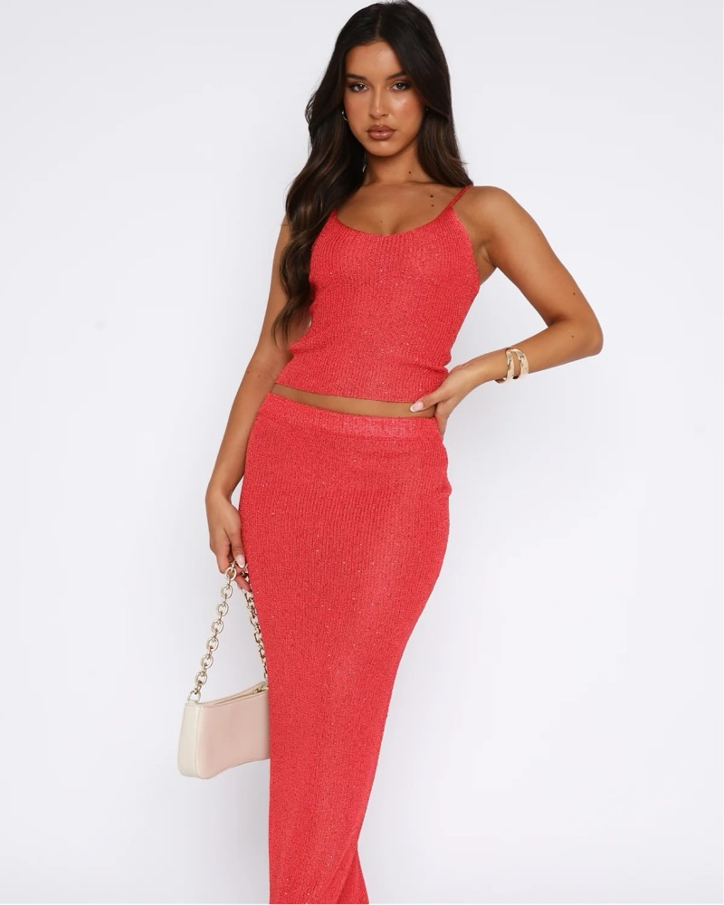 White Fox Star Shining Sequin Knit Top and Maxi Skirt. This eye-catching sequin knit two-piece set is perfect for a night out on the town or on a tropical island. The figure-flattering design and bold color make it a standout choice for a special occasion.