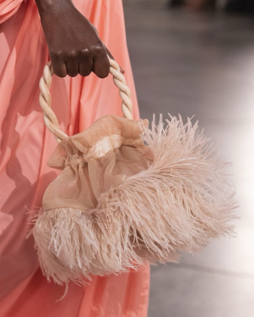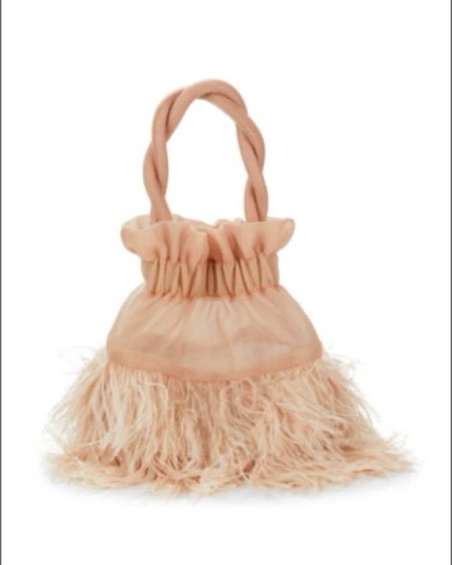 Fashionable mini top handle bag with feather detailing.