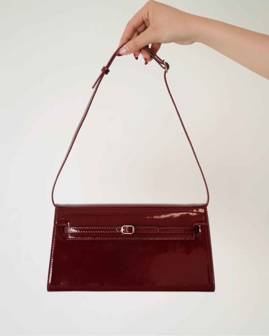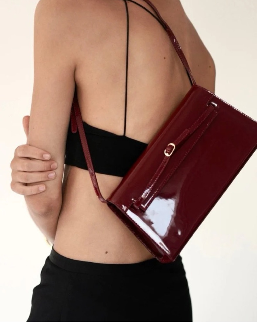 Limited edition dark cherry patent leather. Strap is removable to make it a clutch.