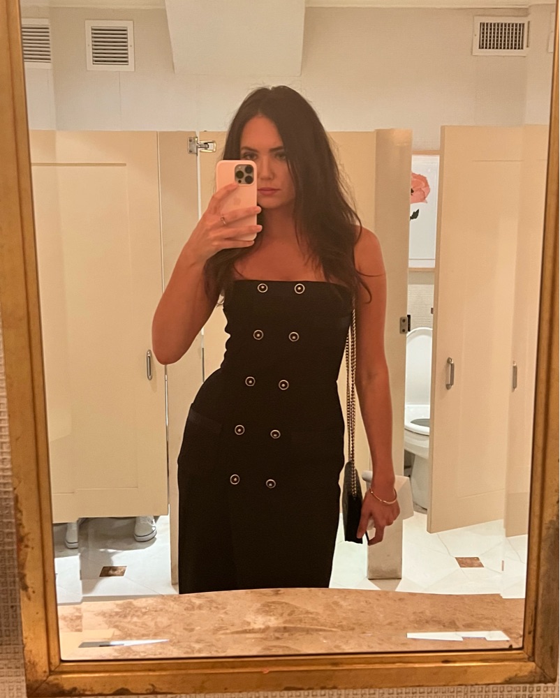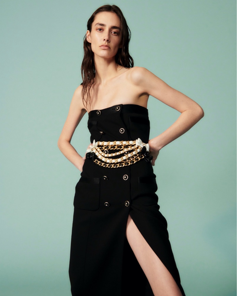 CHANEL Métiers d’Art 20A. size 38. A stunning black strapless wrap full length dress, tuxedo/evening style. Black wool with silk trim, hand pockets and stunning gold clover buttons throughout. The dress is sturdy with real structure, with an internal corset. Dry cleaning and pristine care required!