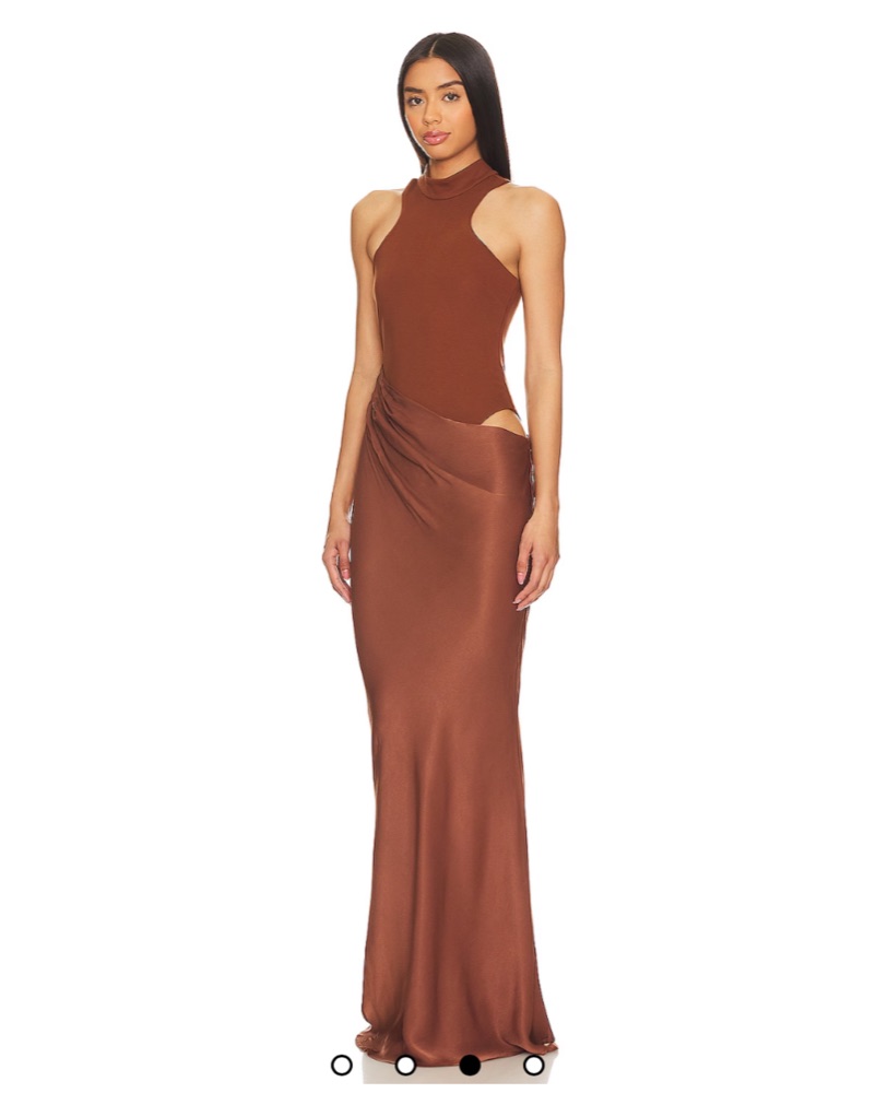 Such a flattering dress! Size is XS but if you are between sizes, size down. Maxi Dress in Nutshell Brown Built-in brief lining with gusset snap button closure. Hidden back zipper closure. Mockneck styling.