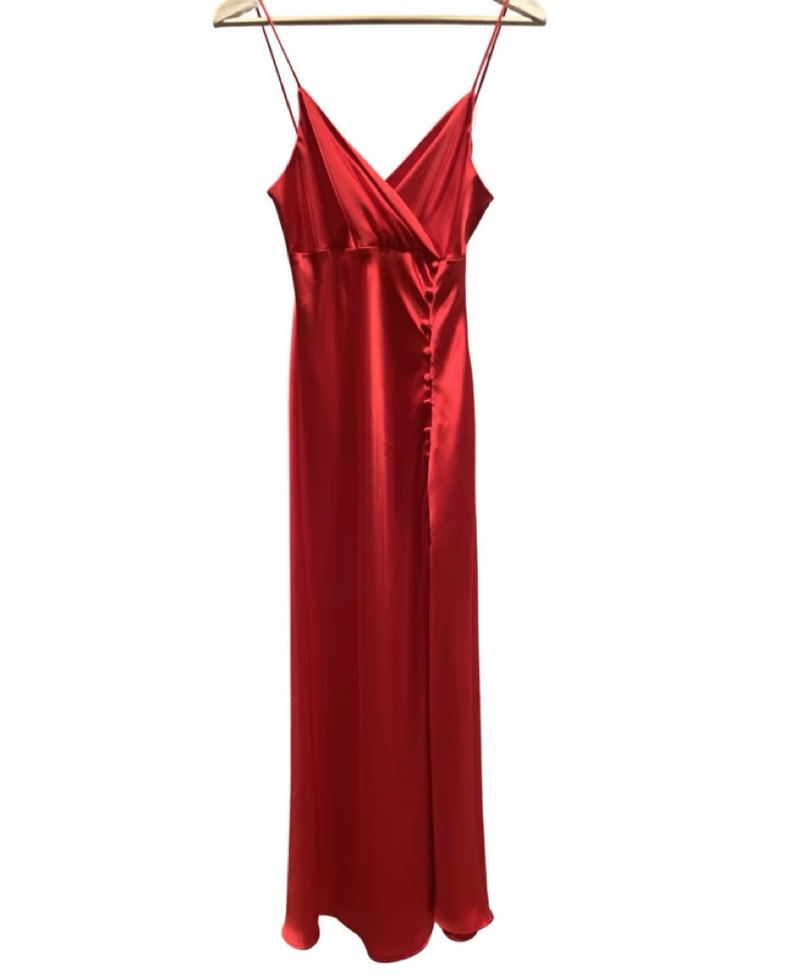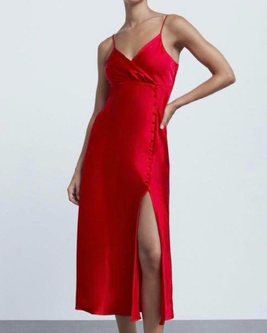 Red silk dress, with a slit and button detailing! Zara size small❤️ midi/maxi length depending on your height