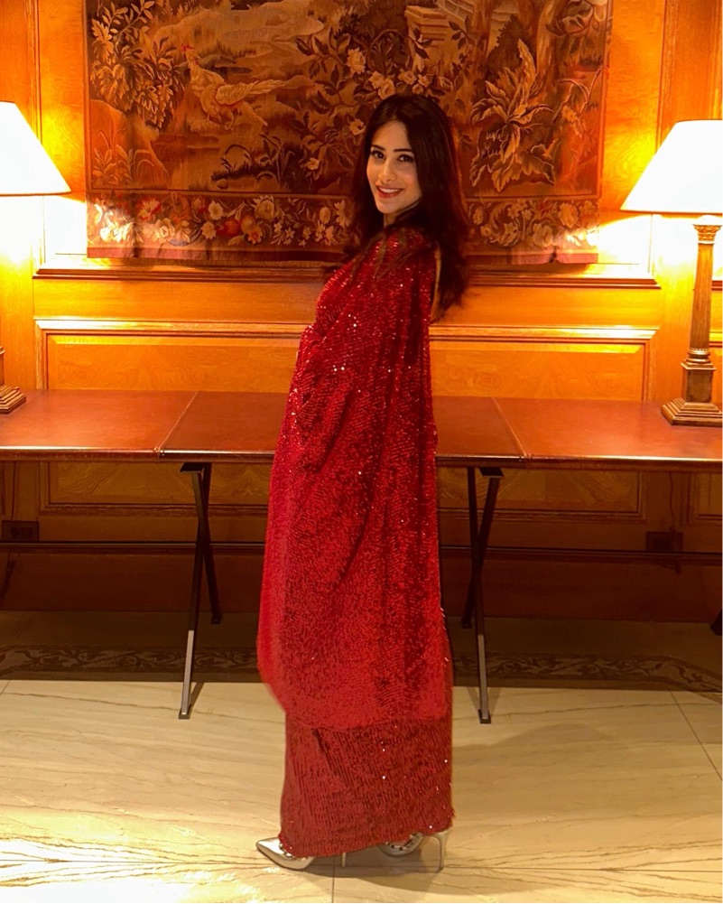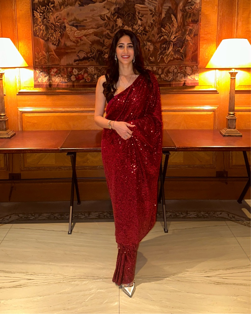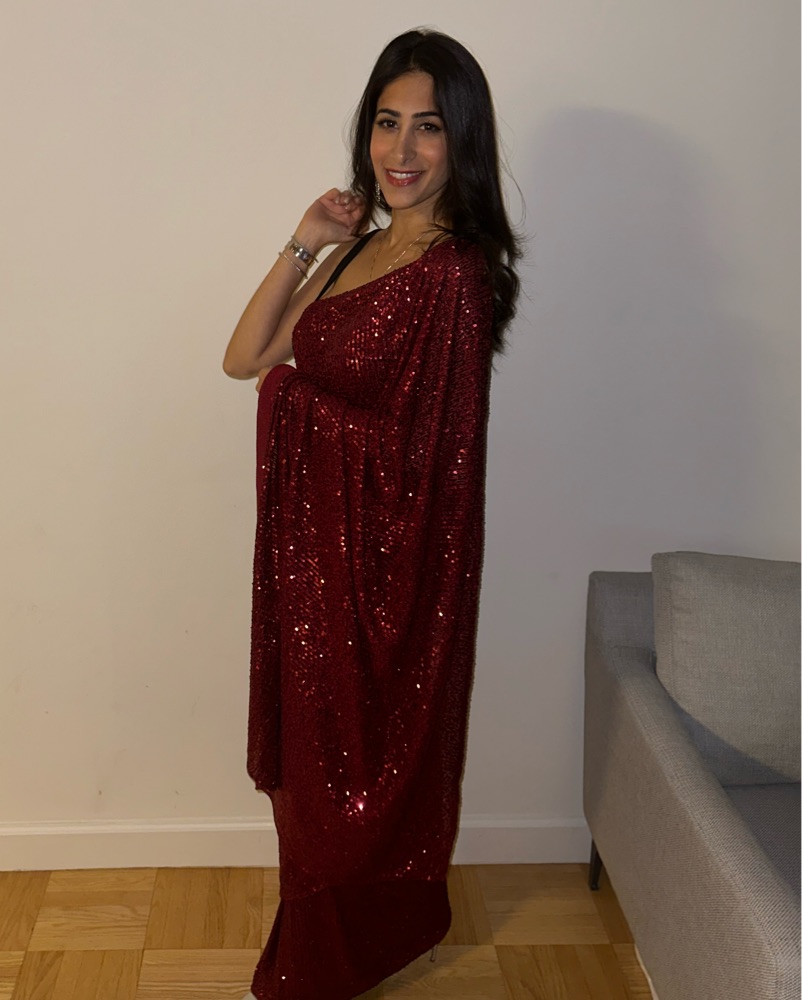 Pre stitched saree and so easy to wear, comes with a red sparkly blouse but i opted for a black bodysuit in these photos