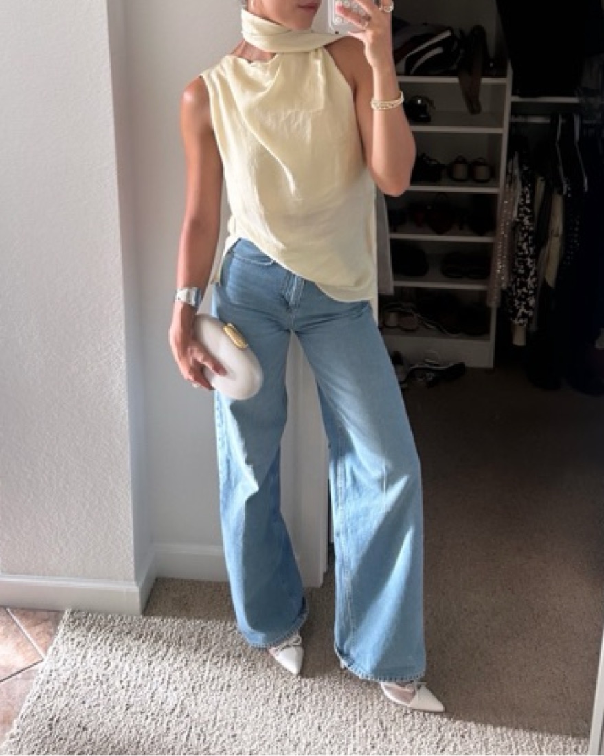 The viral yellow zara bow tie top. Perfect for fall and going out outfits and date night! Tags: fall outfits, game day outfits, nyc style, date night, zara, lover and friends, reformation, ganni, Danielle guizio, with jean, ganni, aritzia, revolve, Realisation par