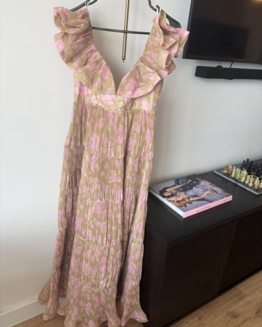 This stunning maxi dress features a beautiful floral print and a pleated skirt, perfect for a special occasion or formal event.