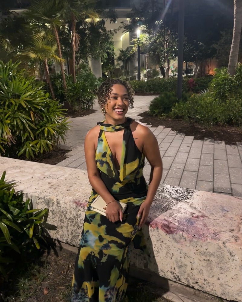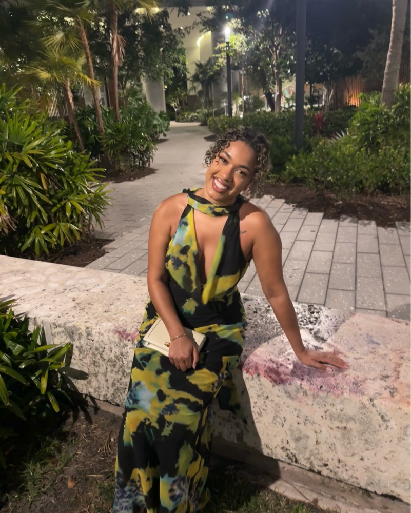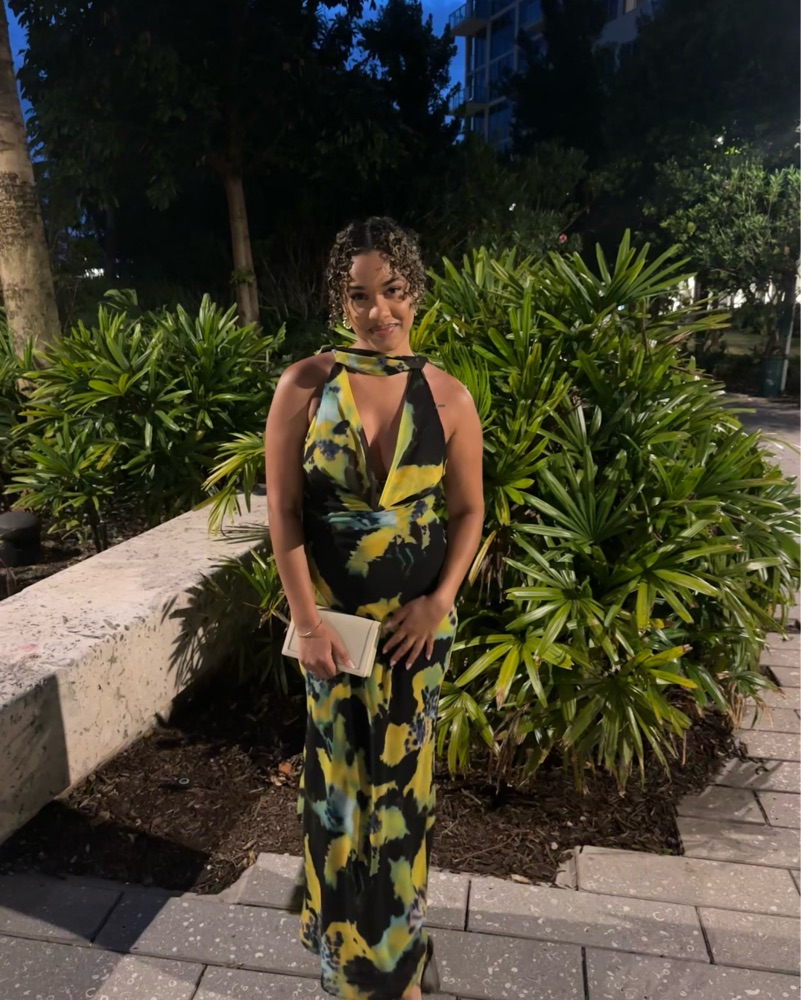 Long dress with flowy and draped neckline at front and back with straps. Matching scarf detail that can be worn with or removed. Matching inner lining and size zip invisible closure.