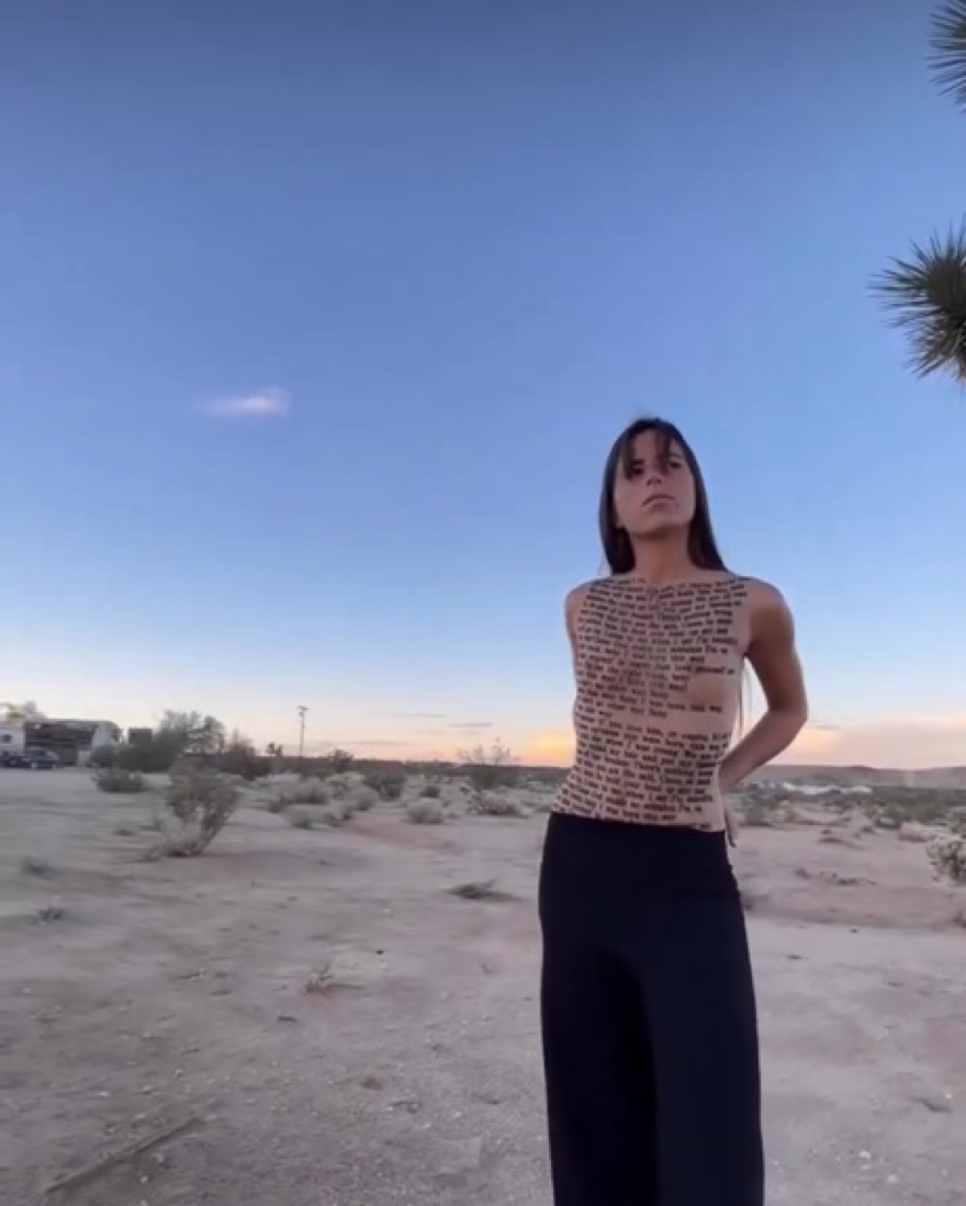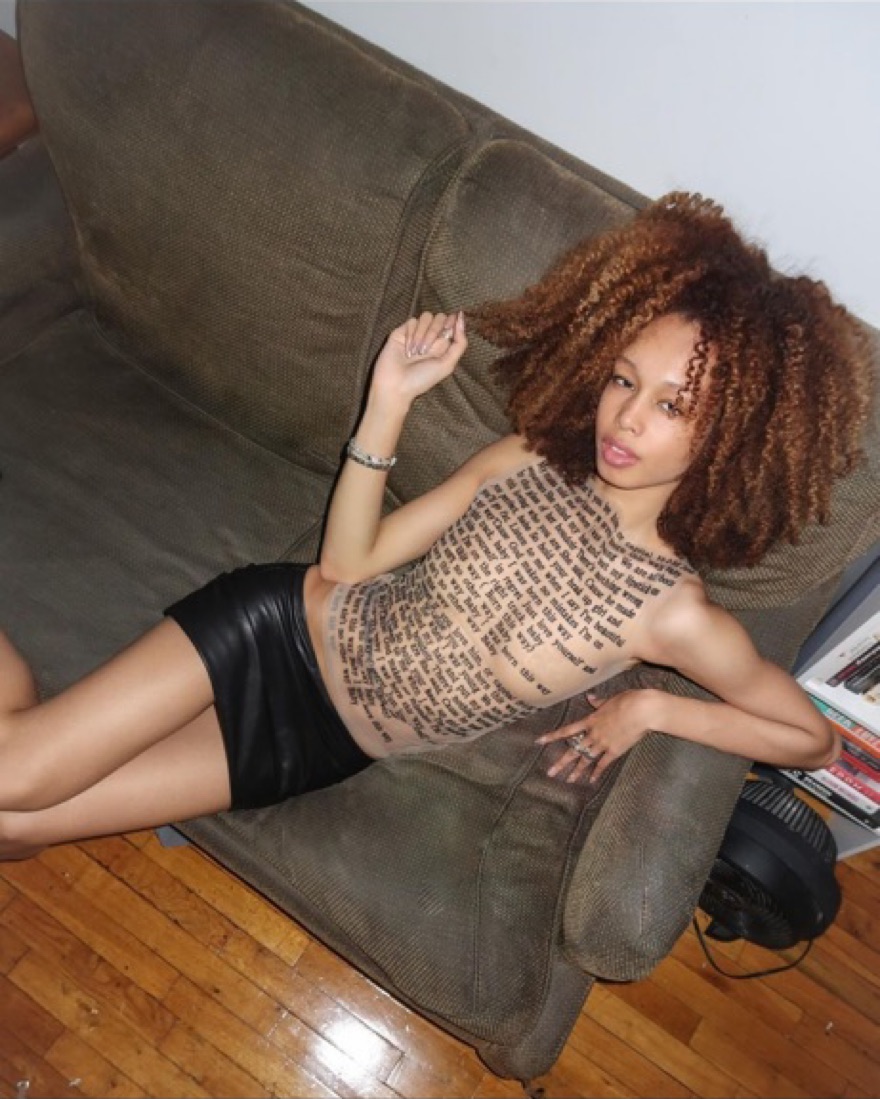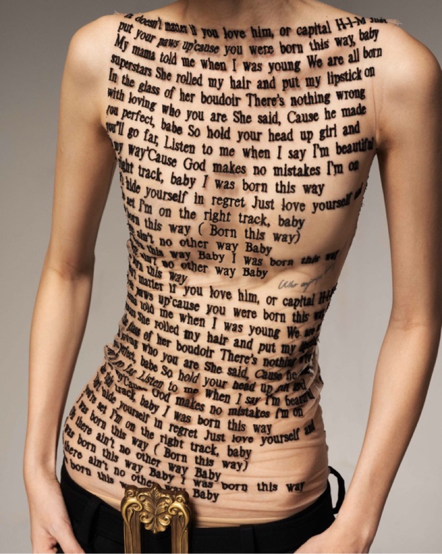 Worn once, in wonderful condition, material is mesh with stitched letters, looks like a real tattoo in non-flash lighting—i get so many compliments on this. it is stunning. XS and fits true to size. slight stretch. long in length. can be dressed up or down.