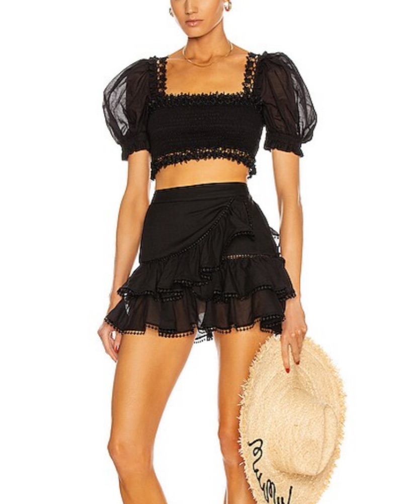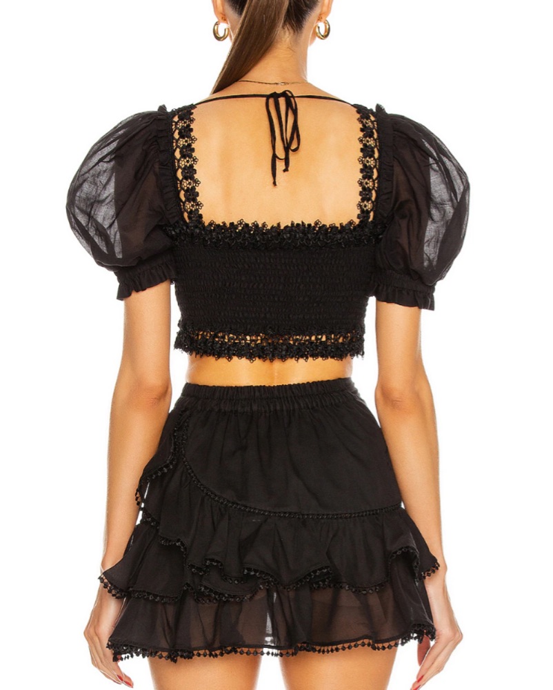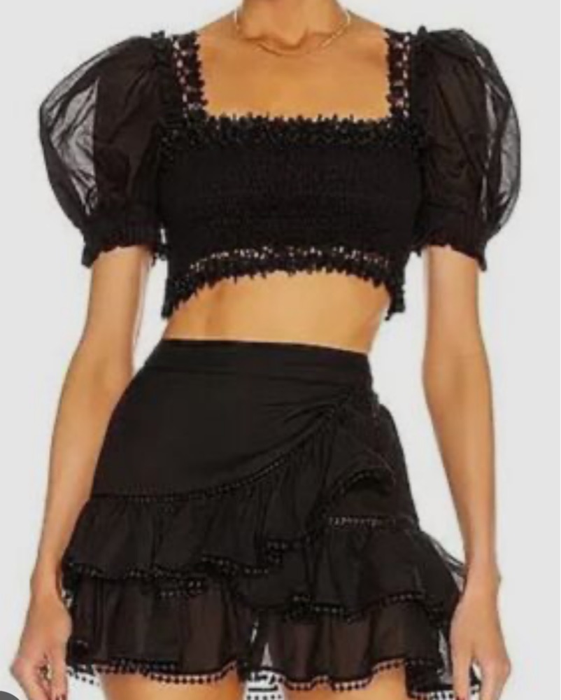 Matching skirt also available! Square neckline is enriched with beautiful floral motifs. The elastic bodice contours the torso and enhances the bust, which together with the volume of its sleeves make our Judy top a piece of timeless beauty. a