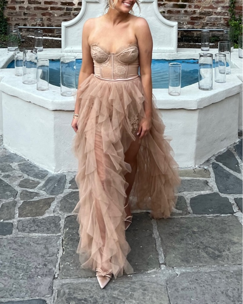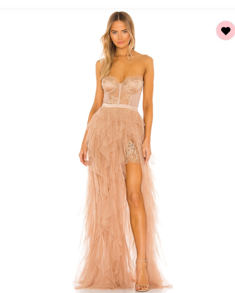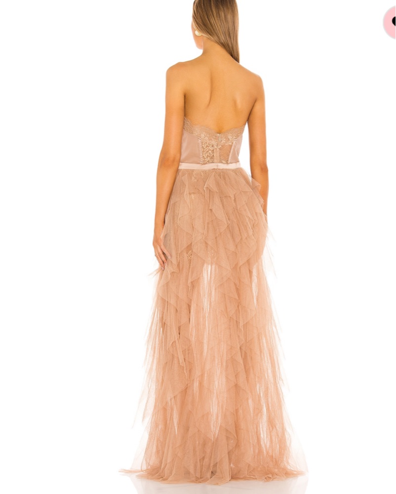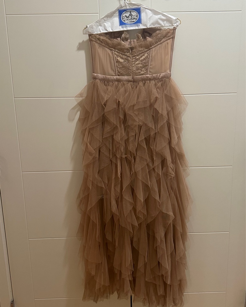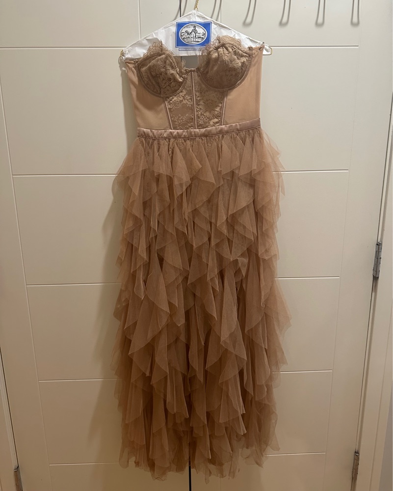 Color is warm taupe. Has been worn once for a wedding and dry cleaned. Alterations have been made to the dress to shorten it. I am 5’ 2” and was wearing 3.74” heels (see photos for length reference).