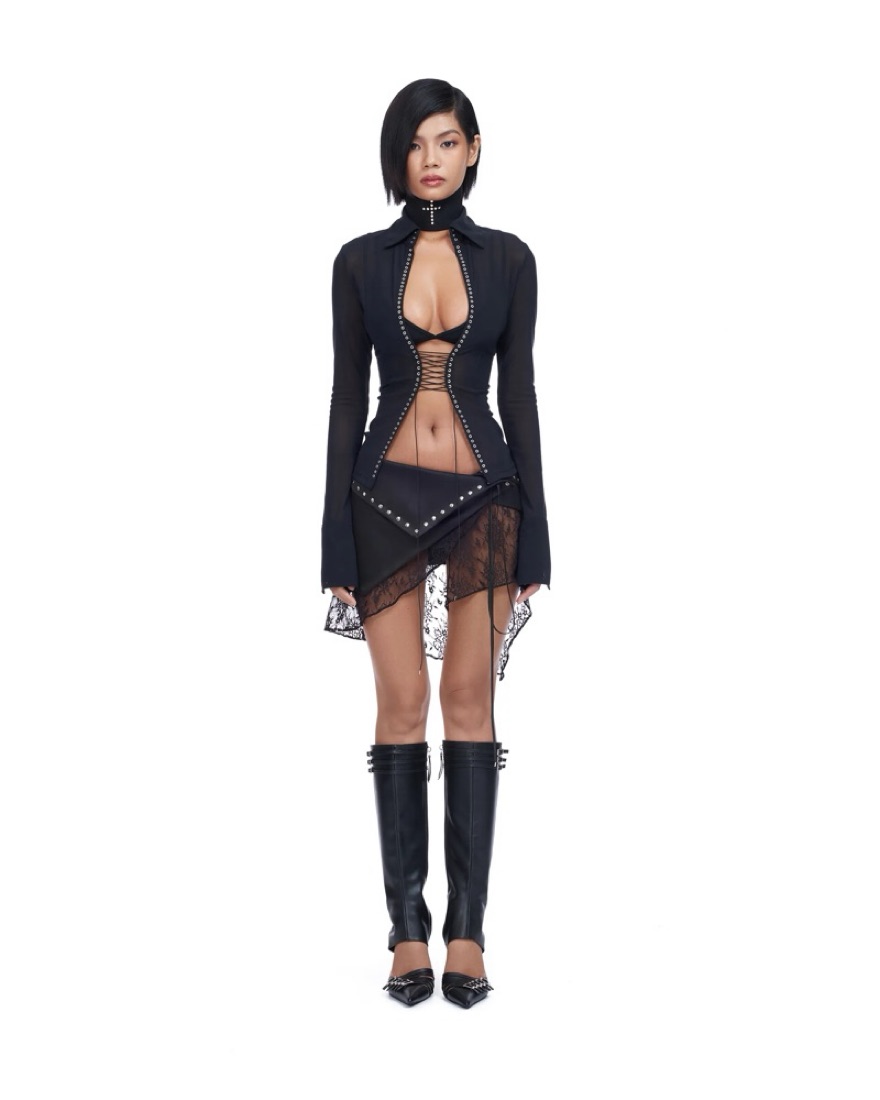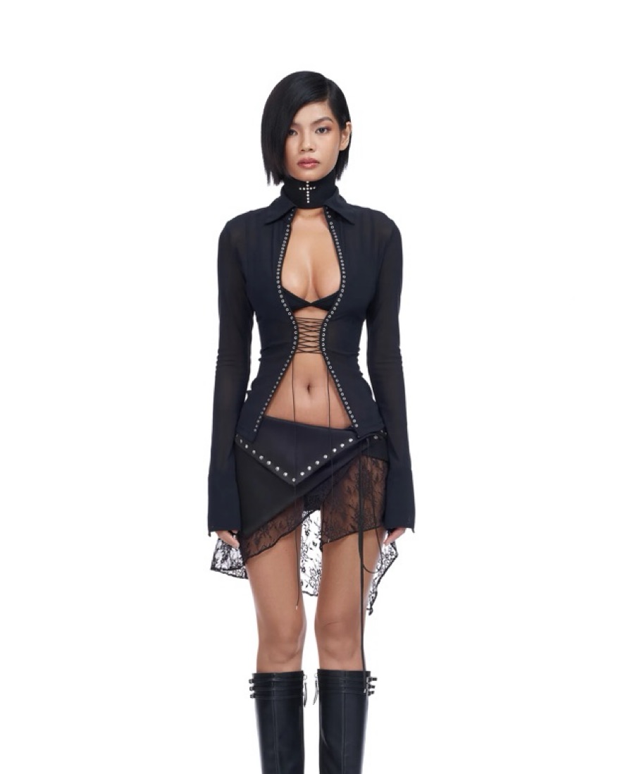 Fanci Club knife + heart Black Mesh Long Sleeve lace-up detail Top