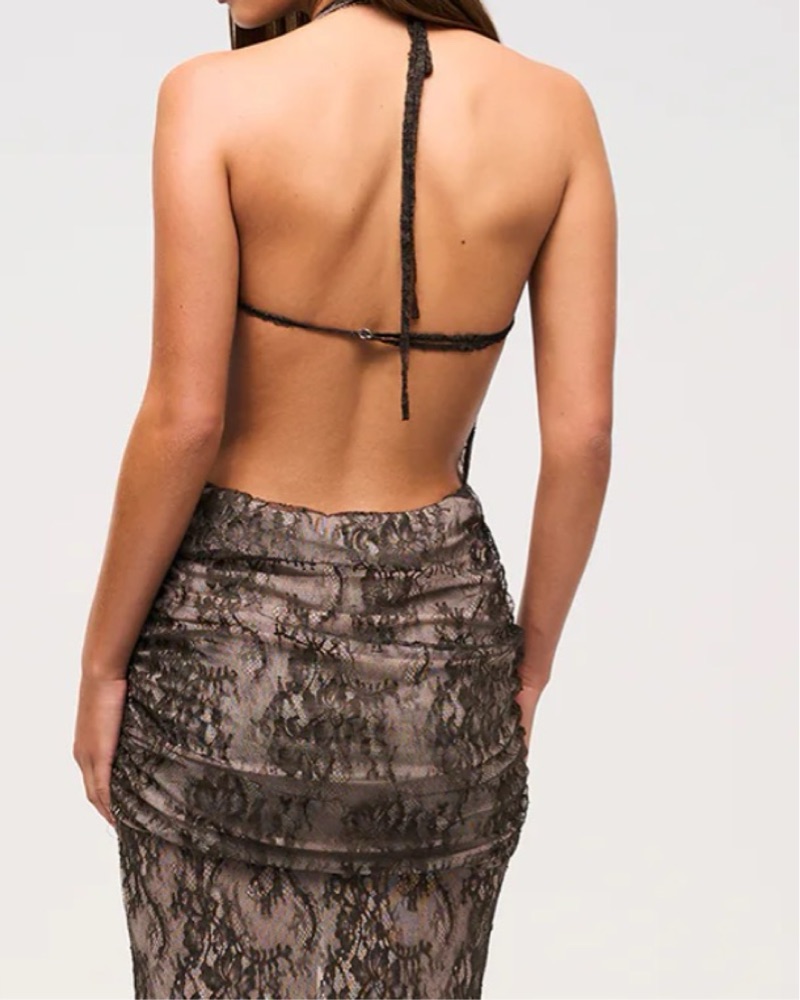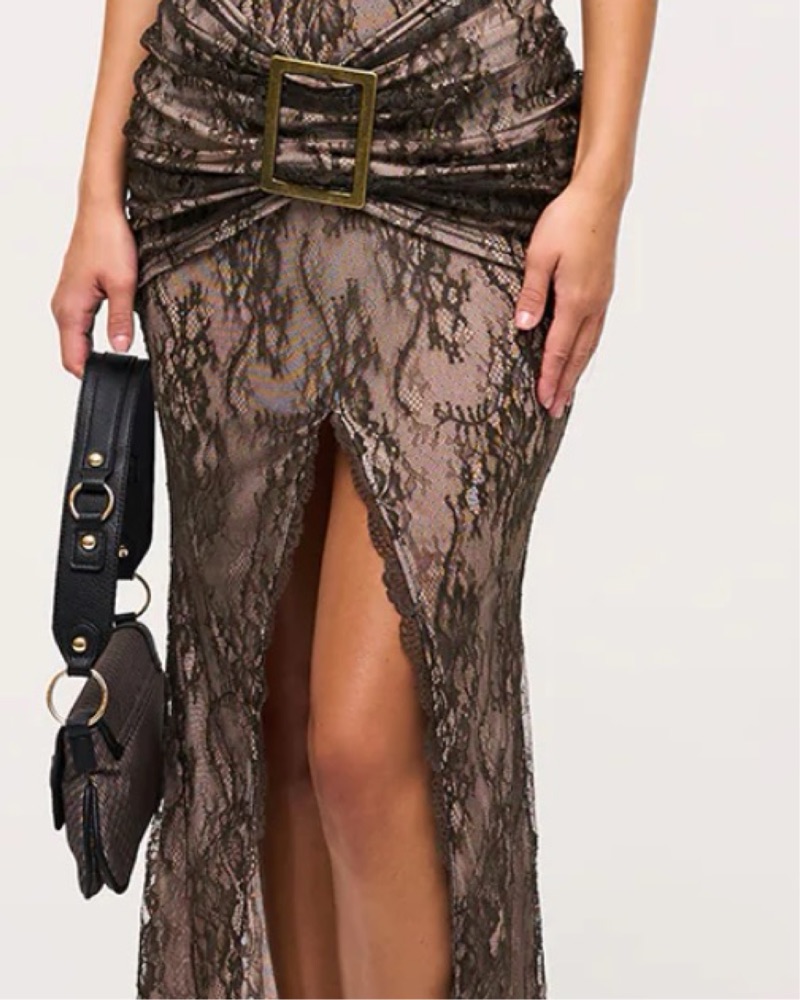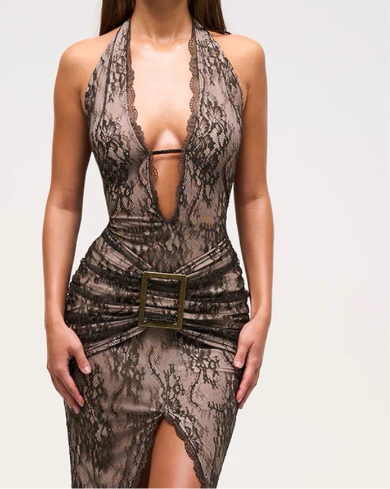 Maxi dress, bodycon fit, lace overlay with mesh lining, deep v neckline, underbust follows into an adjustable back strap, scalloped lace trim throughout, ruched overlay skirt detail with antique brass buckle, backless design. Size 8, fits like a size 6