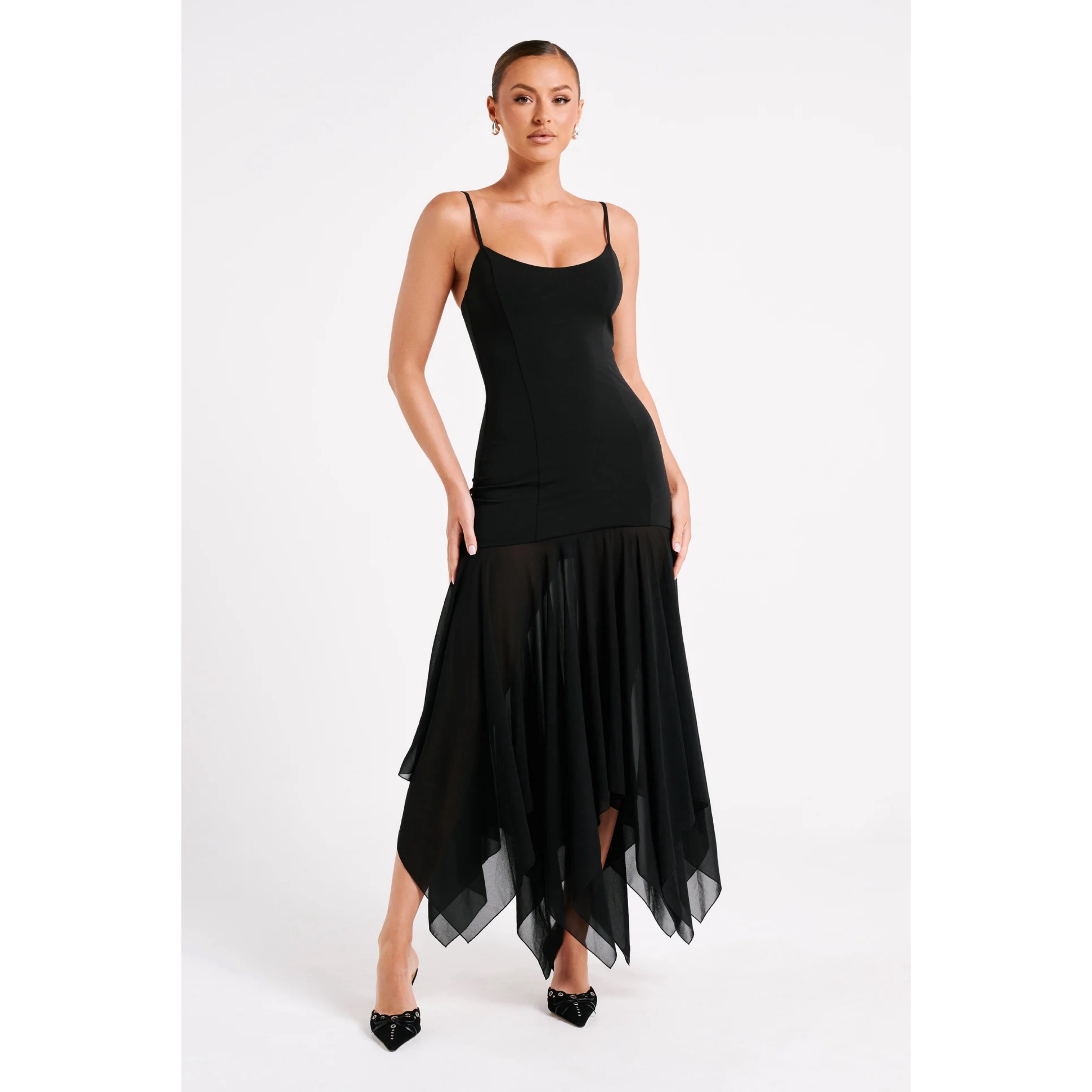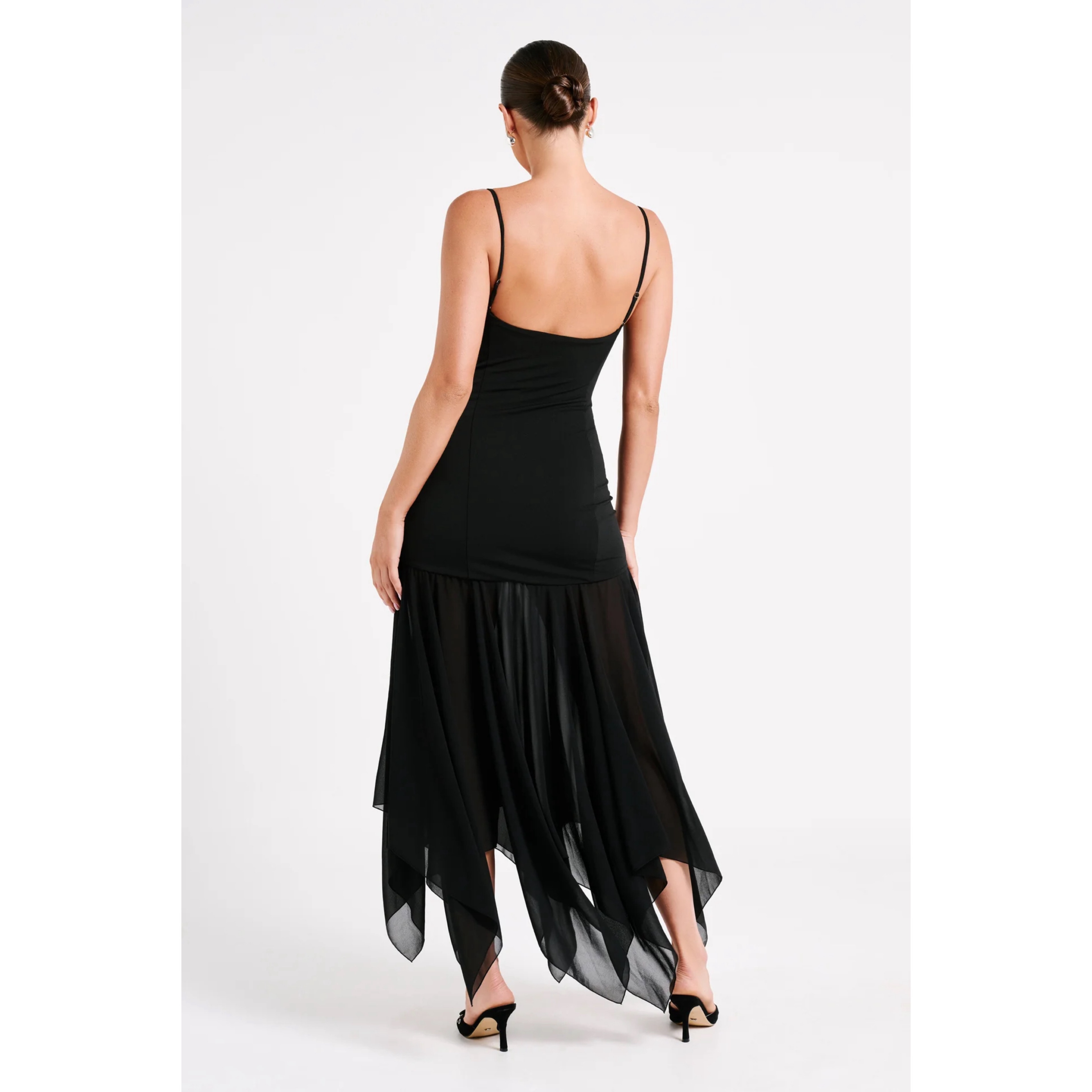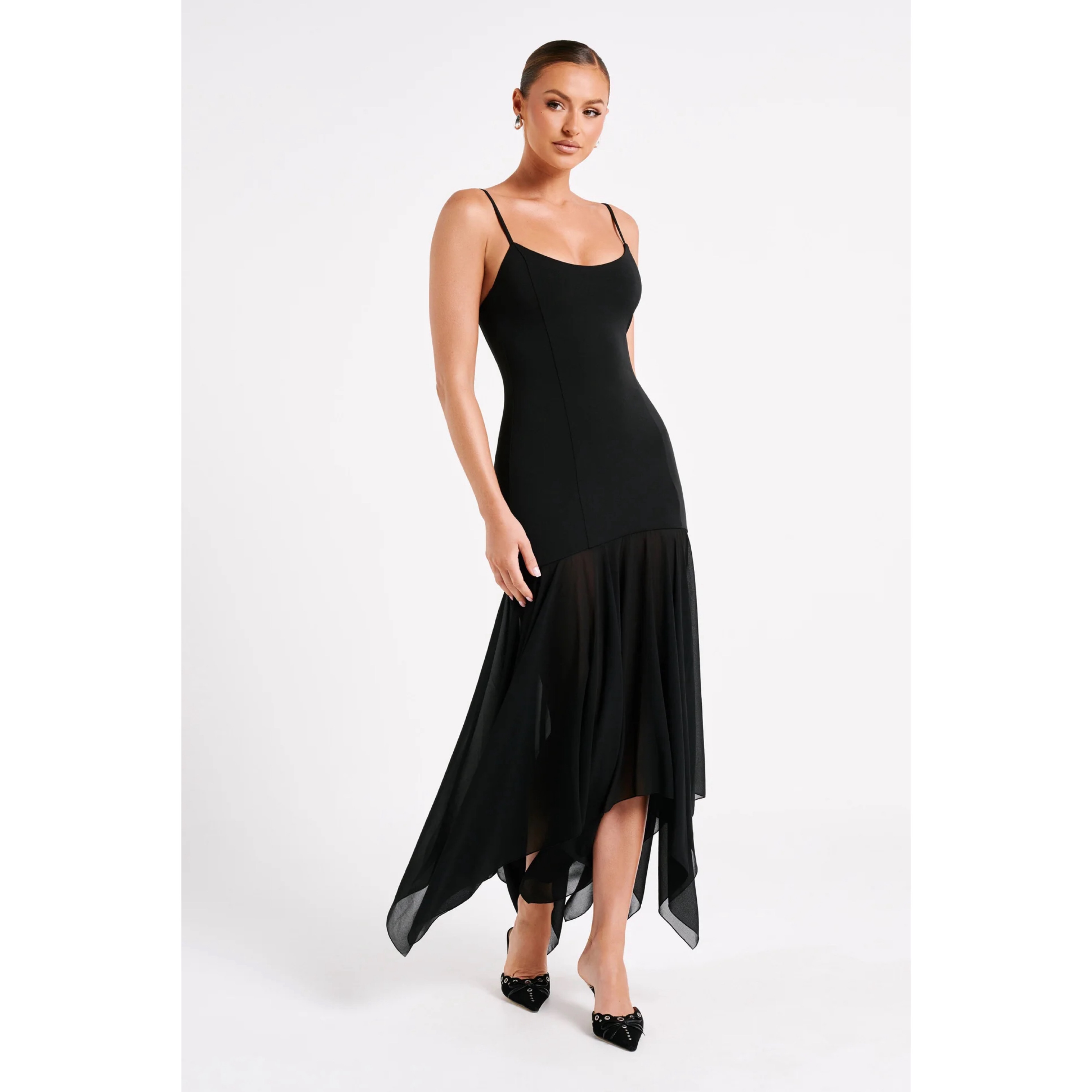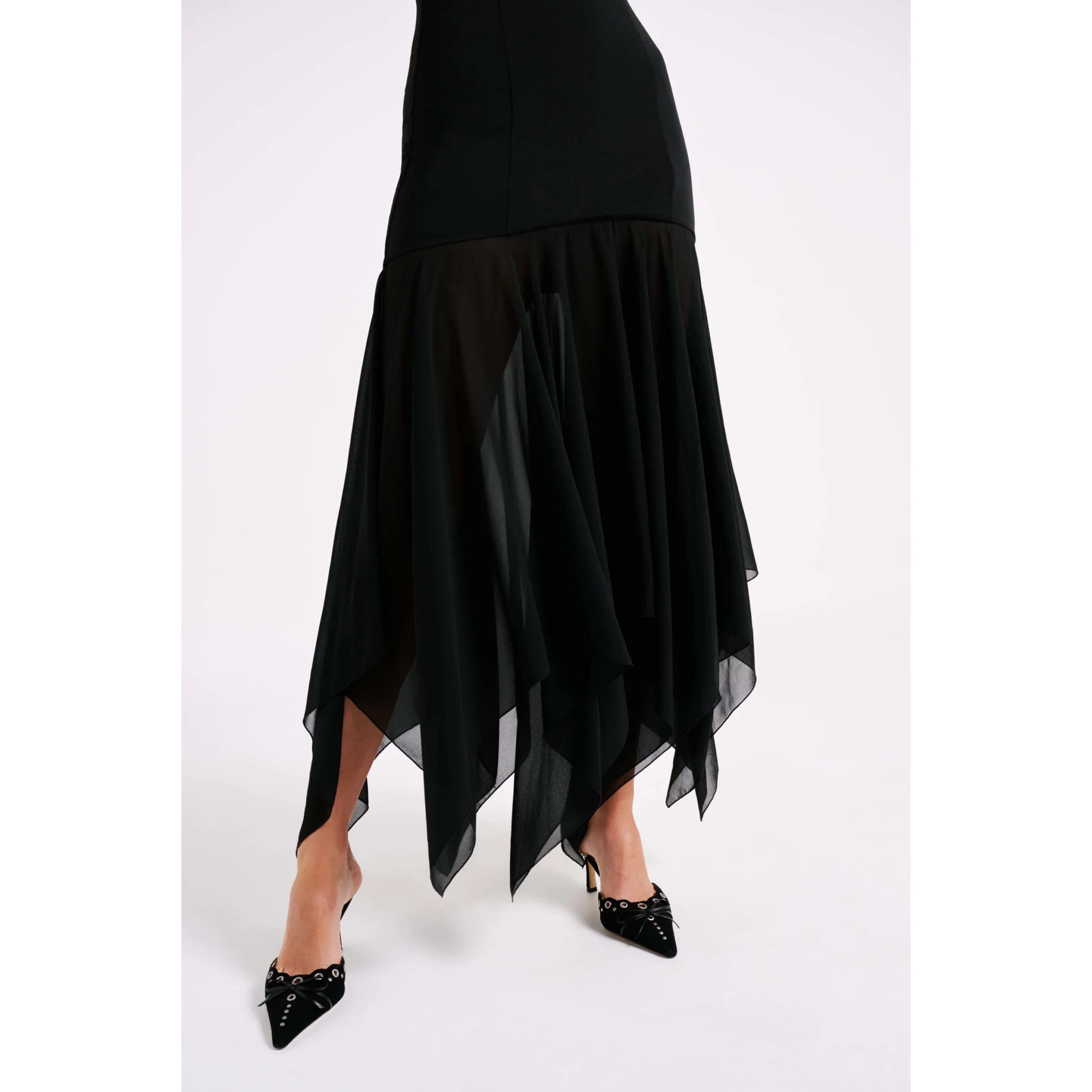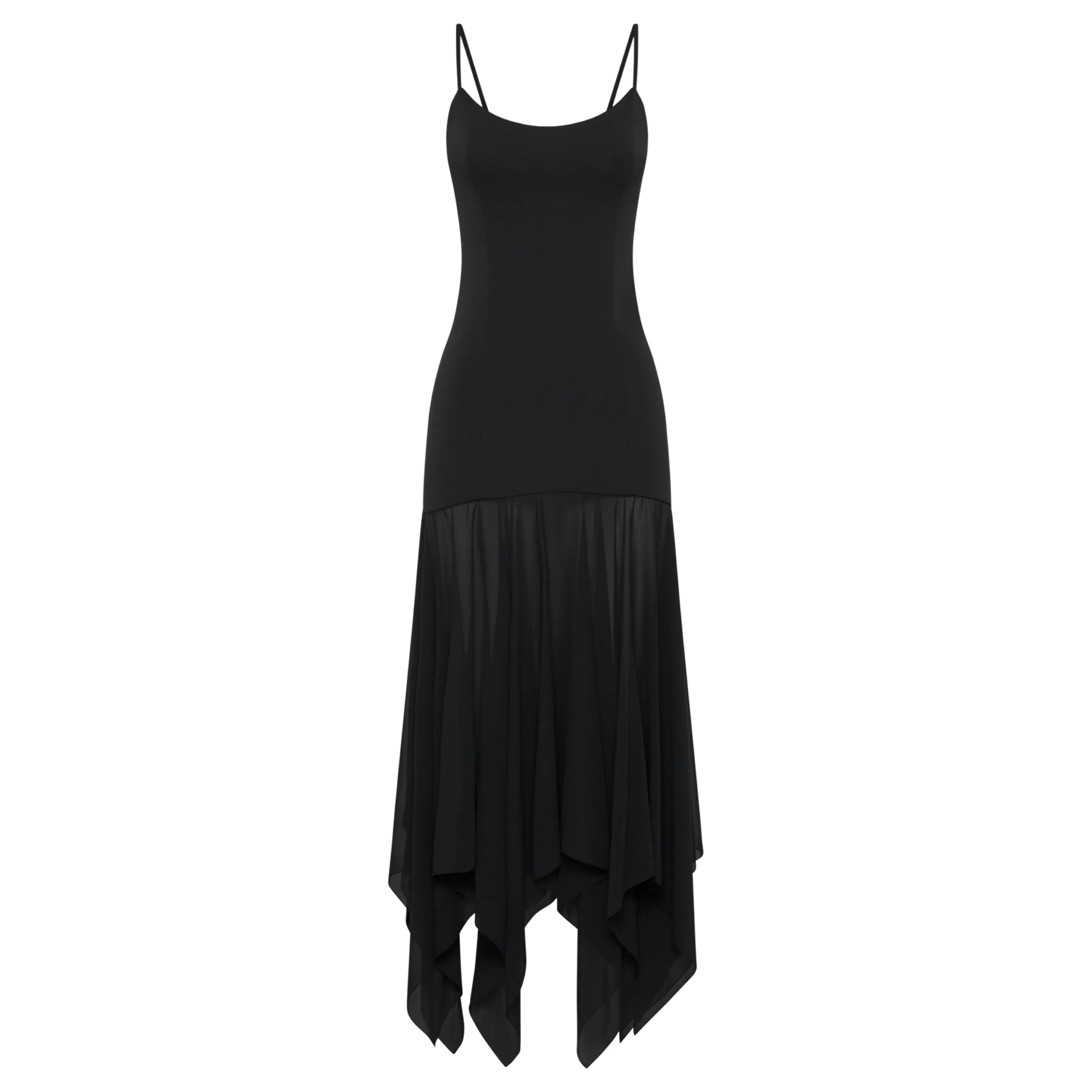 Scoop neck maxi dress with a chiffon handkerchief hem. Gorgeous for formal events! (Has stretch, could also fit size S)