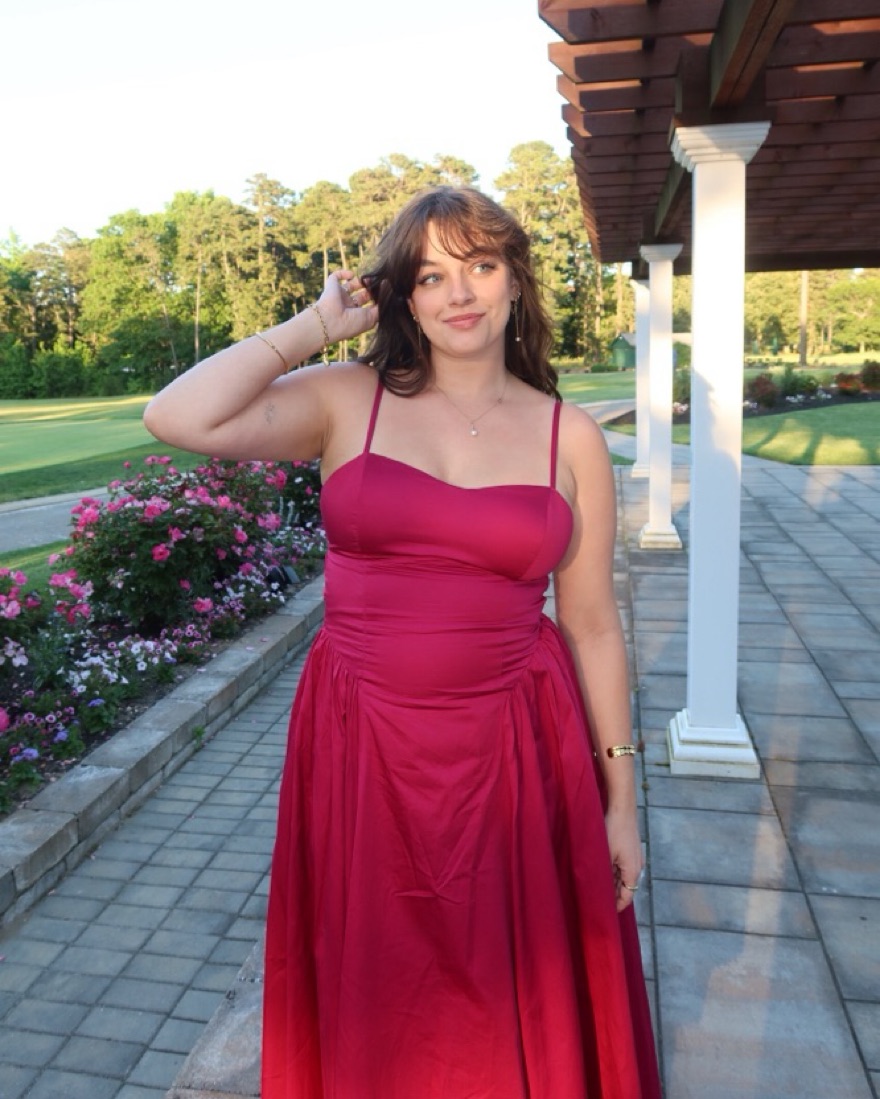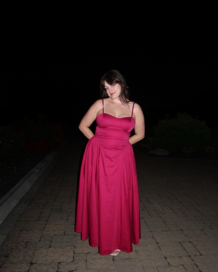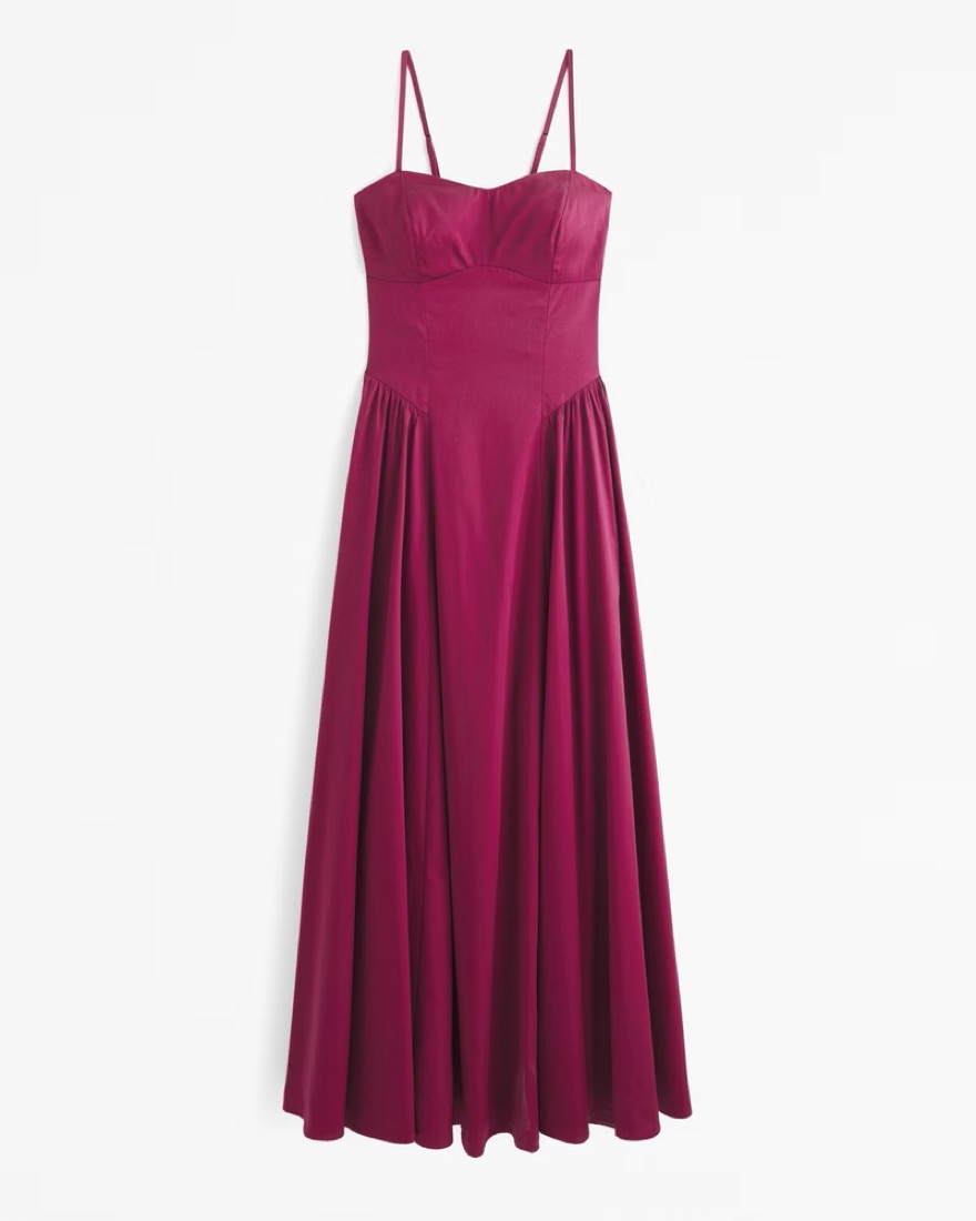 This stunning fuchsia gown is perfect for a formal event or summer dinner. The flowing A-line silhouette and sweetheart neckline create a romantic, feminine look.