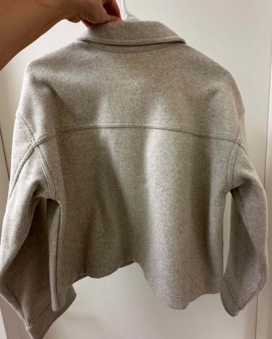 Slightly cropped with a boxy, structured look. Color is oatmeal ish? Surprisingly warm and cozy. Button closure. Fits S/M