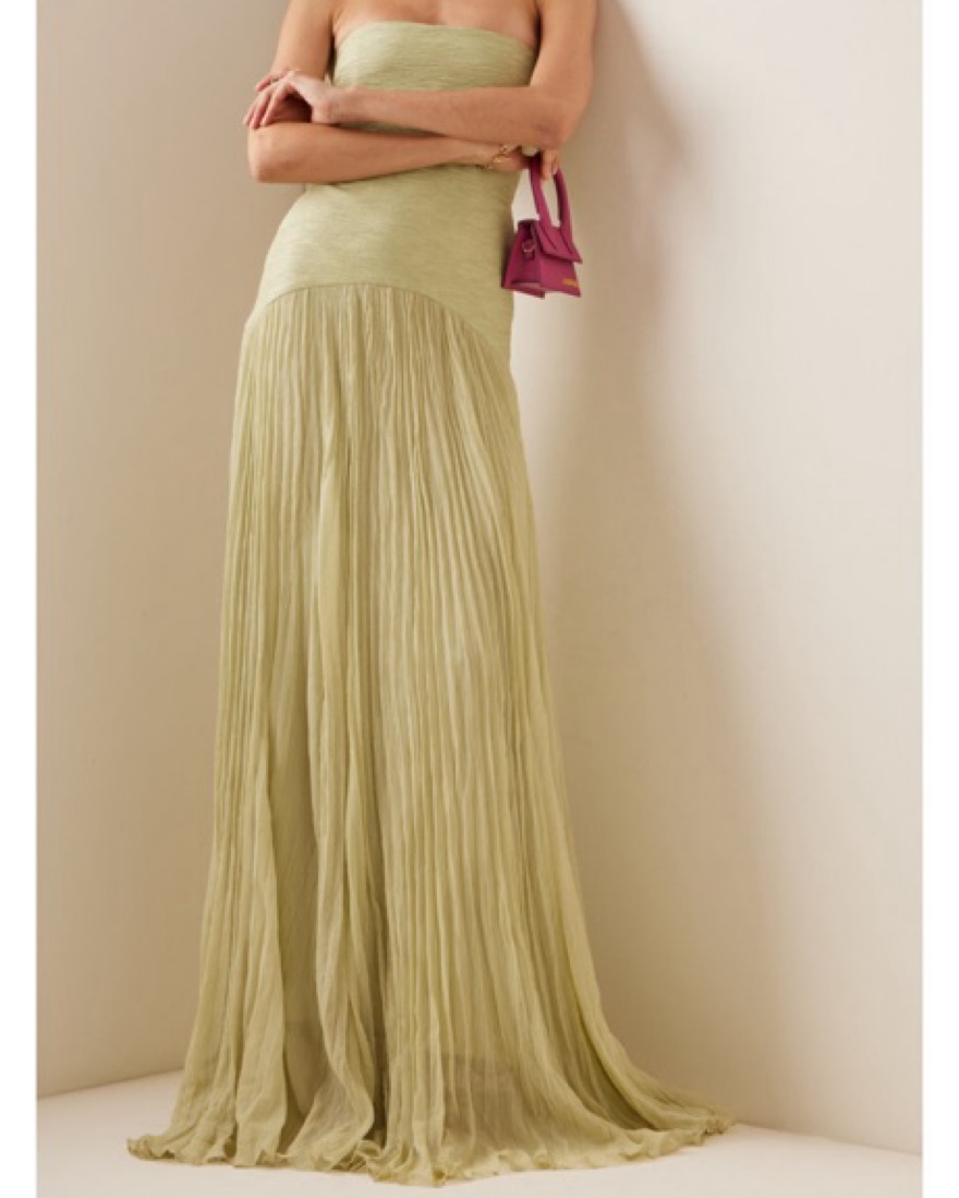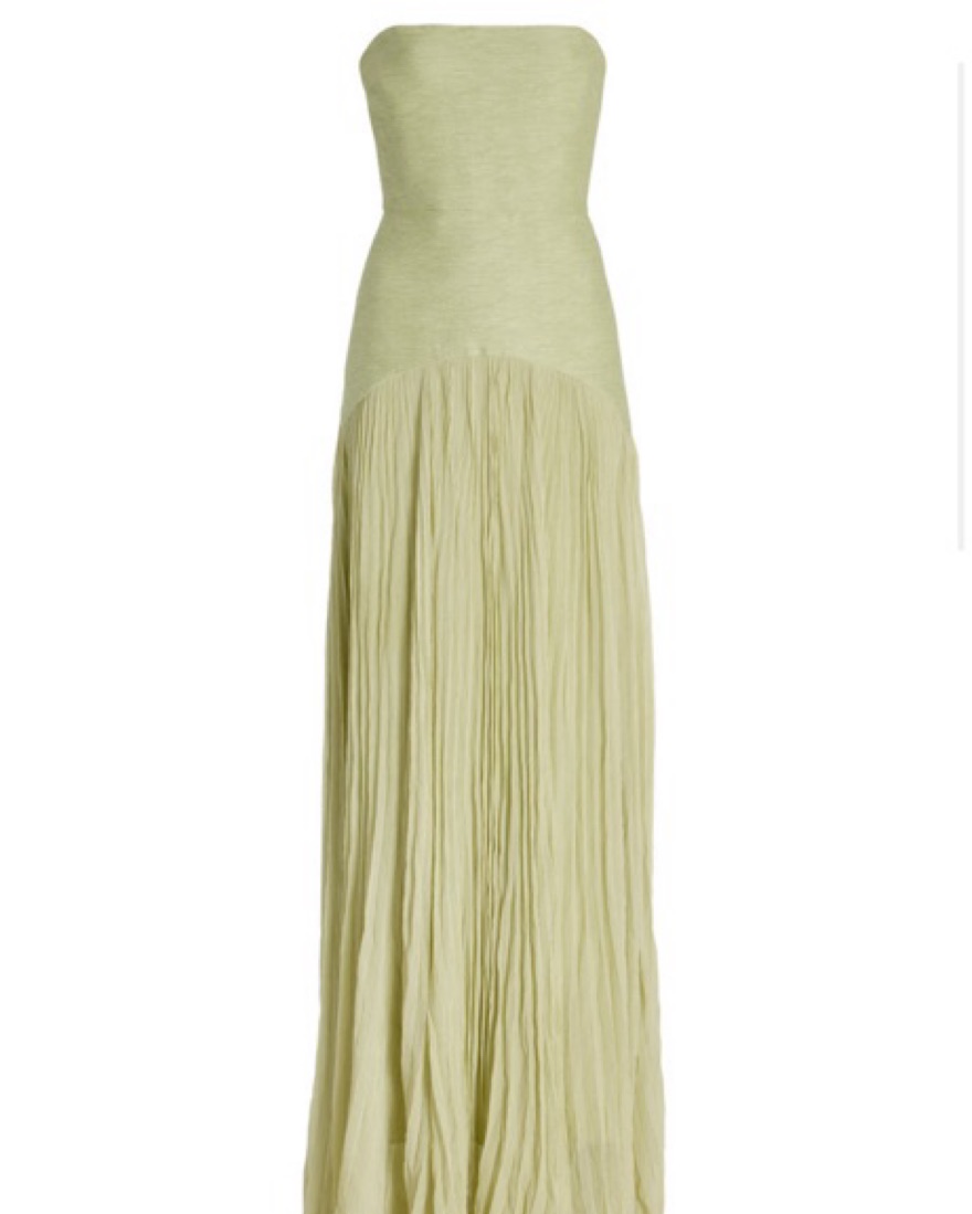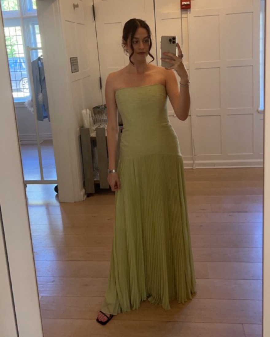This stunning pleated maxi dress is perfect for formal occasions. The flowing, airy silhouette and vibrant color make it a head-turning choice. I wore it to a September wedding! Recently dry cleaned and in good condition. Some damage at the bottom of the skirt.