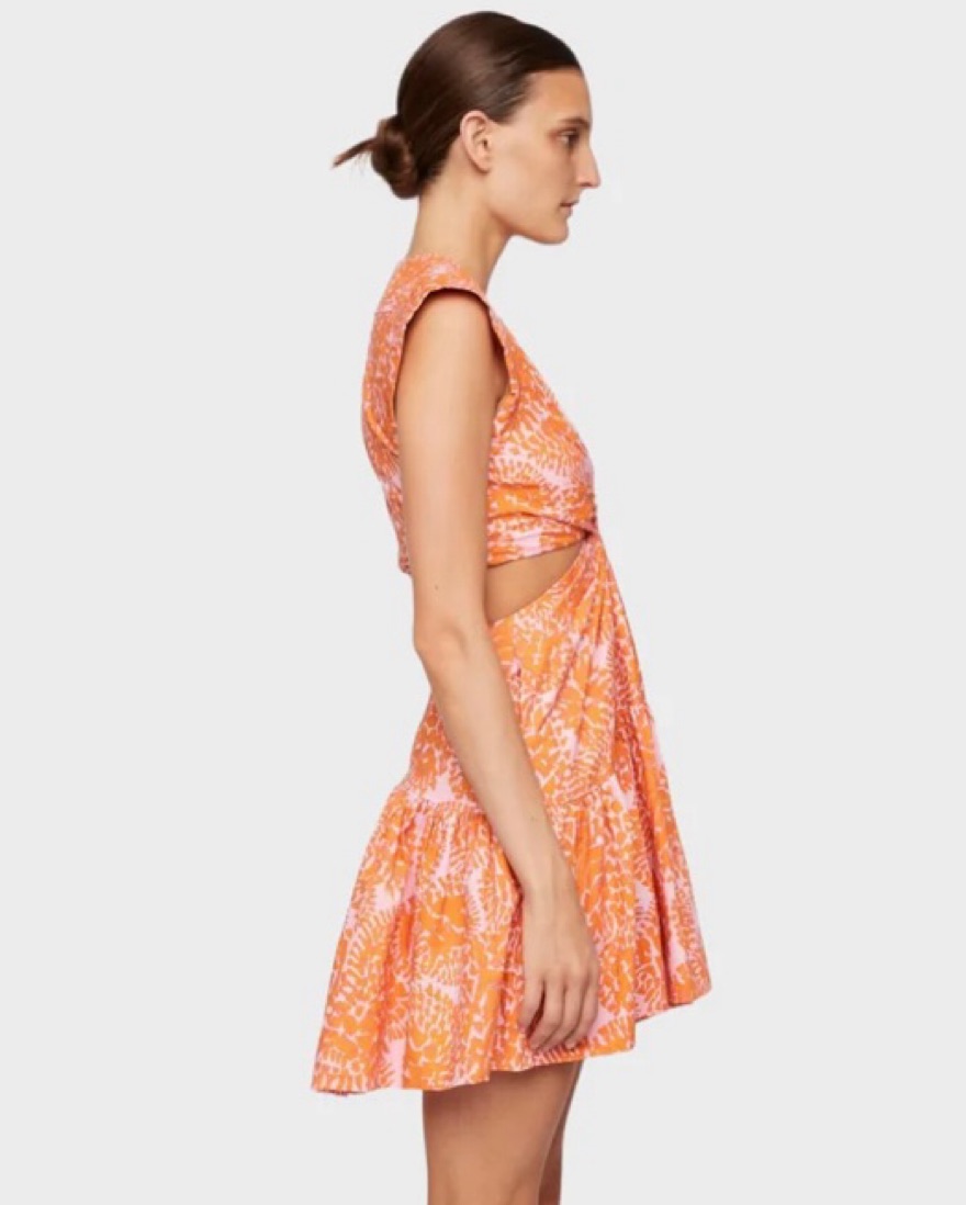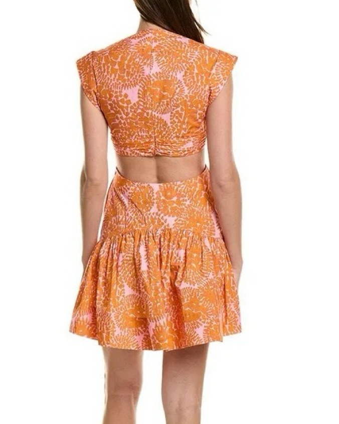 Printed mini dress Features gathered bodice Waist and back cut-outs V-neckline A-line silhouette Hem falls above the knee Back zip closure