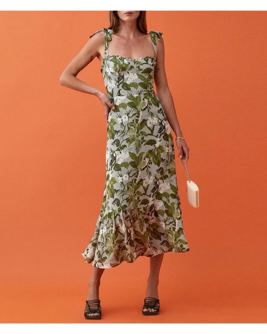 Ankle alert. The Nikita is fitted in the bodice and waist with a relaxed fitting skirt. This midi length dress has a ruffle edged neckline, adjustable strap ties, and a trumpet skirt. It gives you a pretty good balance of comfort and shape. The Nikita Dress pairs well with the Gigi Strappy Mid Heel